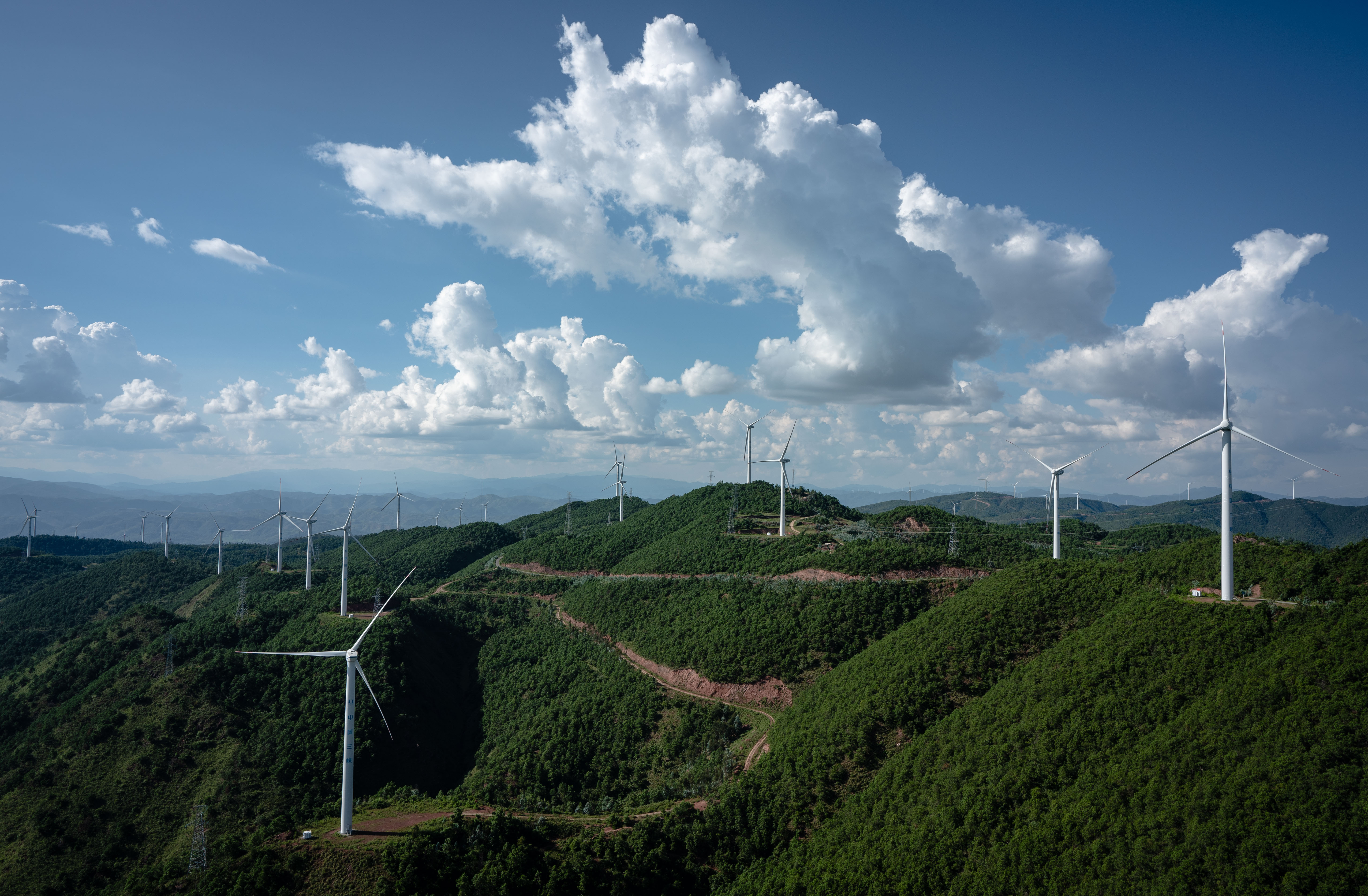 這是2022年8月18日在云南省楚雄彝族自治州姚安縣內拍攝的風力發(fā)電機。新華社記者 王冠森 攝