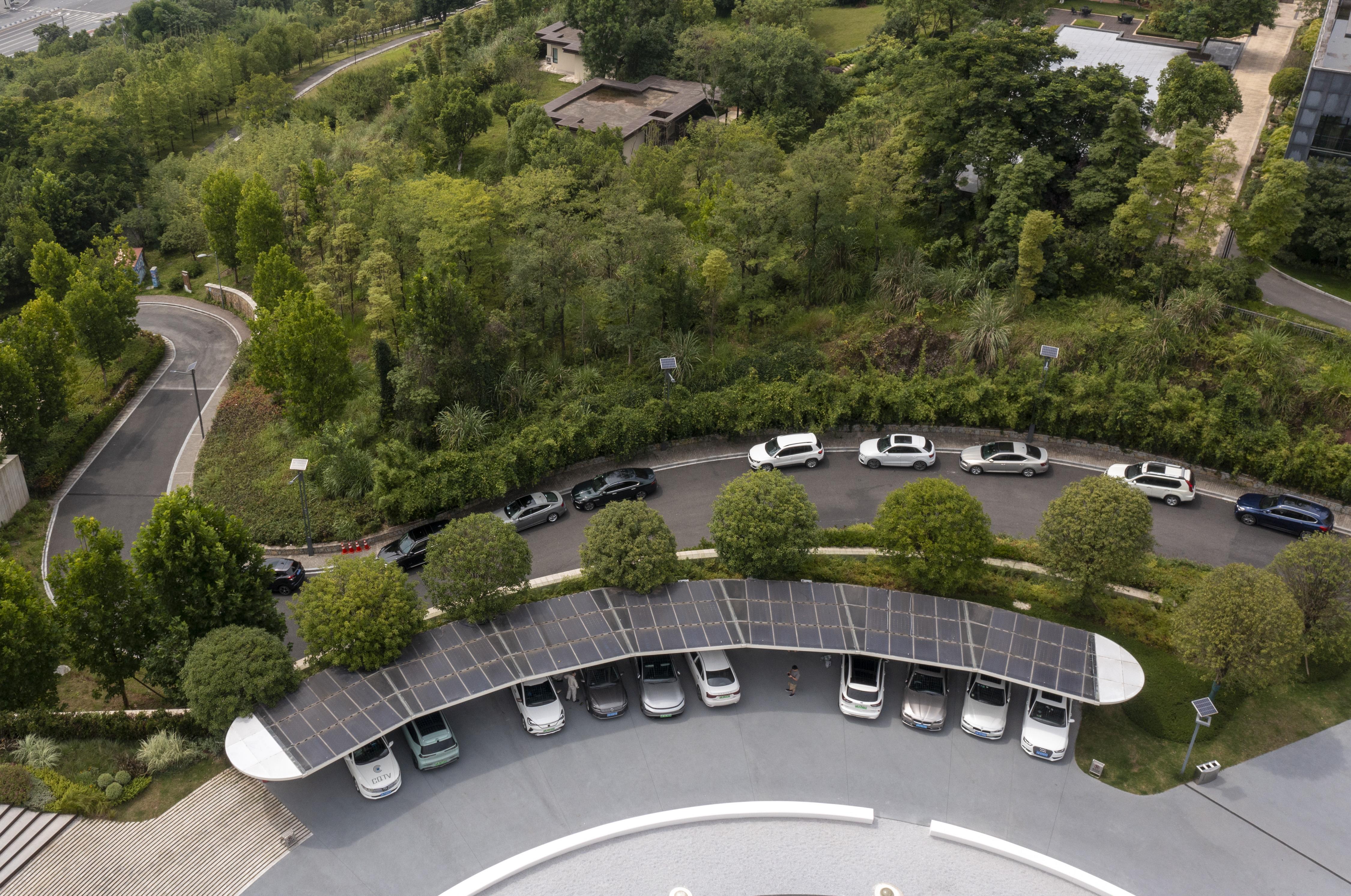 2022年6月16日拍攝的已建成投用的重慶首座光伏充電發(fā)用一體充電站(無人機照片)。新華社記者 劉潺 攝