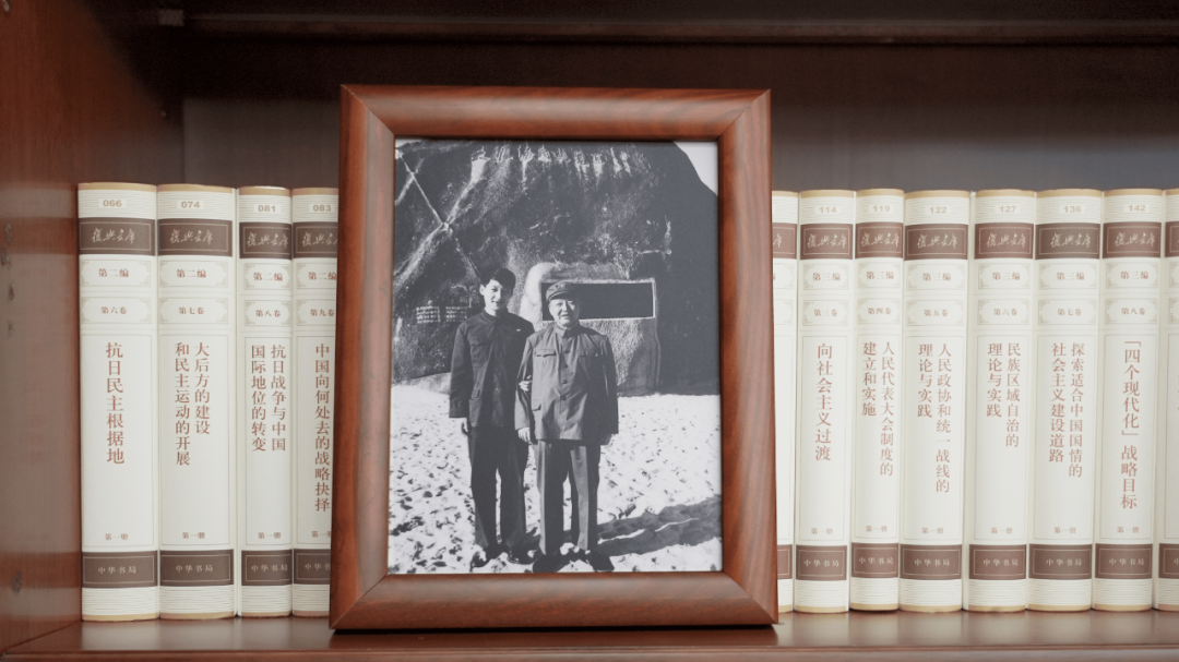 書架上擺放著一張合影。這是1999年9月30日,江澤民同志、朱镕基同志、習(xí)仲勛同志在慶祝建國五十周年招待會(huì)上。這張照片第一次出現(xiàn)在習(xí)近平總書記的書架上。