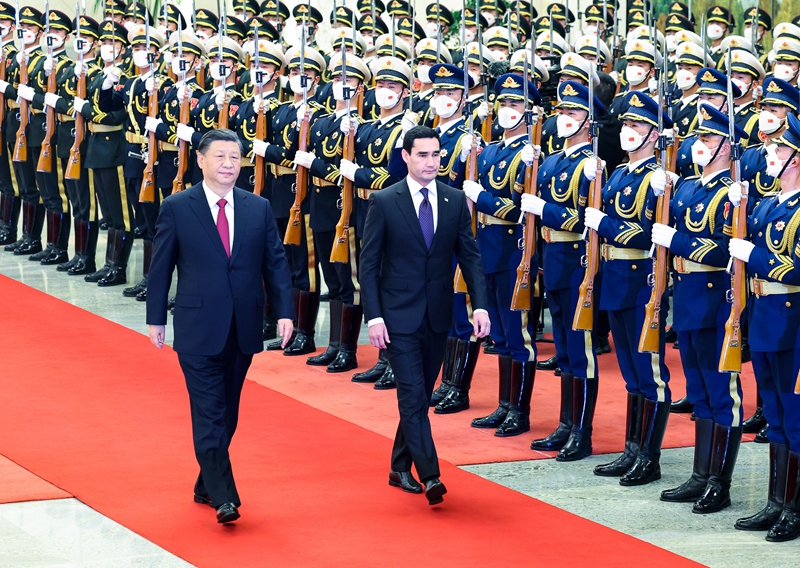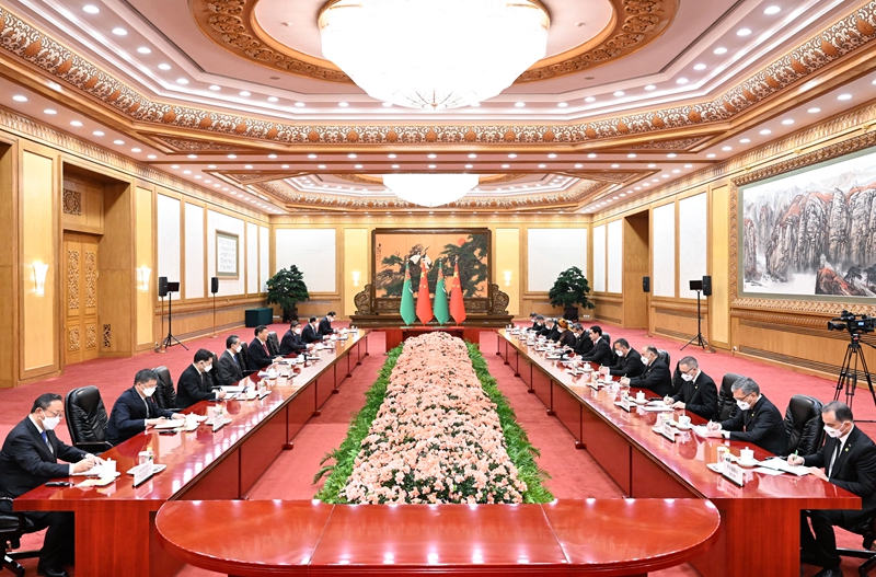 習近平指出,這是你就任總統(tǒng)后首次訪華,今天又是中土建交紀念日,我們?nèi)嬷\劃中土關(guān)系下一步發(fā)展,共同宣布將兩國關(guān)系提升為全面戰(zhàn)略伙伴,意義重大。中國共產(chǎn)黨正在團結(jié)帶領(lǐng)全國各族人民以中國式現(xiàn)代化全面推進中華民族偉大復(fù)興,土方正在積極推進土庫曼斯坦復(fù)興戰(zhàn)略。中土兩國理念相通,目標相似,利益相連,在發(fā)展振興路上要攜手努力,發(fā)揮互補優(yōu)勢,深挖合作潛力,實現(xiàn)共同發(fā)展。中方愿同土方一道,持續(xù)深化中土全方位合作,推動構(gòu)建中土命運共同體,使兩國關(guān)系在更高水平上向前發(fā)展。