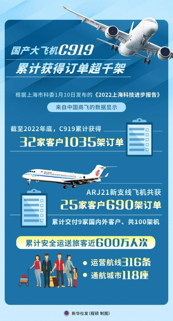 根據(jù)上海市科委1月10日發(fā)布的《2022上海科技進(jìn)步報告》,來自中國商飛的數(shù)據(jù)顯示,2022年12月,C919大型客機首架機交付首家用戶東方航空公司,邁出市場運營“第一步”。截至2022年底,C919累計獲得32家客戶1035架訂單。