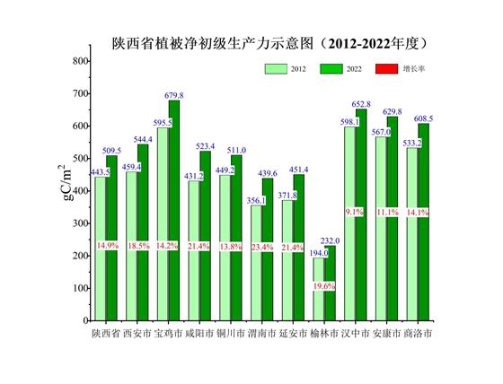 2012-2022年分市元生產(chǎn)力增長(zhǎng)率分析結(jié)果表明,新時(shí)代10年,全省各市生態(tài)蛋糕越做越大,元生產(chǎn)力均有不同程度增長(zhǎng)。有關(guān)中東大門之稱的渭南是全省元生產(chǎn)力增長(zhǎng)最快的市,增長(zhǎng)率為23.4%,從2012年237.4公斤/畝,增加到2022年的293.1公斤/畝,增加55.7公斤/畝;咸陽(yáng)、延安增長(zhǎng)率均為21.4%,并列全省第二,分別由2012年的287.5公斤/畝、247.9公斤/畝,增加到2022年的349.0公斤/畝、300.9公斤/畝,分別增加61.5公斤/畝、53公斤/畝。榆林居第四,增長(zhǎng)19.6%。其后,依次分別西安增長(zhǎng)18.5%,寶雞14.2%,商洛14.1%,銅川13.8%,安康11.1%,漢中9.1%。