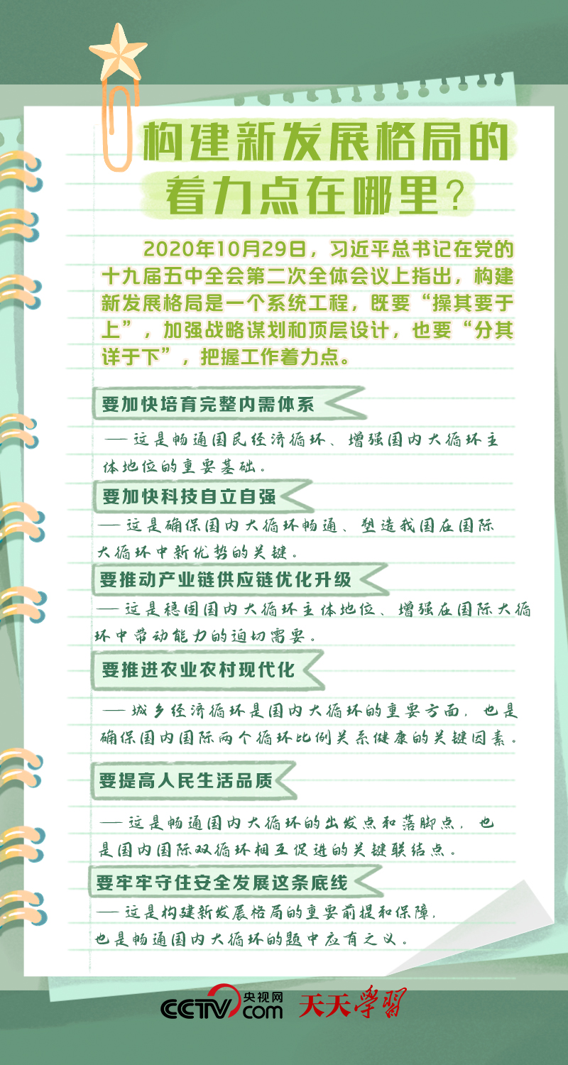 天天學(xué)習(xí) 構(gòu)建以國(guó)內(nèi)大循環(huán)為主體、國(guó)內(nèi)國(guó)際雙循環(huán)相互促進(jìn)的新發(fā)展格局,是根據(jù)我國(guó)發(fā)展階段、環(huán)境、條件變化,特別是基于我國(guó)比較優(yōu)勢(shì)變化,審時(shí)度勢(shì)作出的重大決策。構(gòu)建新發(fā)展格局是事關(guān)全局的系統(tǒng)性、深層次變革,是立足當(dāng)前、著眼長(zhǎng)遠(yuǎn)的戰(zhàn)略謀劃。
