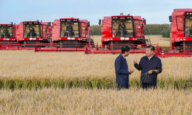 2018年9月25日,習(xí)近平在黑龍江農(nóng)墾建三江管理局七星農(nóng)場(chǎng)萬(wàn)畝大地號(hào)了解糧食生產(chǎn)和收獲情況。新華社記者 謝環(huán)馳 攝