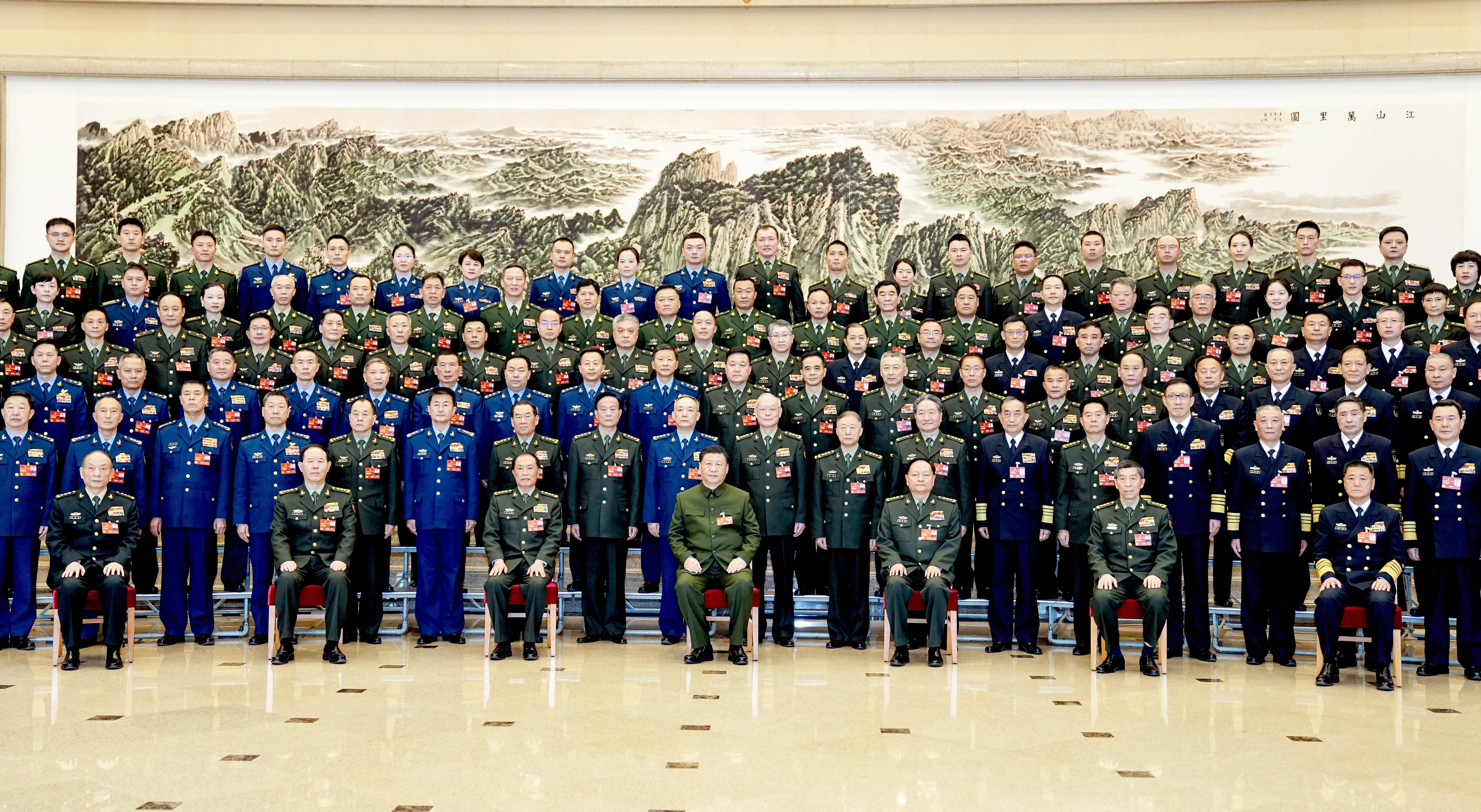 3月8日下午,中共中央總書記、國(guó)家主席、中央軍委主席習(xí)近平出席十四屆全國(guó)人大一次會(huì)議解放軍和武警部隊(duì)代表團(tuán)全體會(huì)議。這是會(huì)議開始前,習(xí)近平親切接見代表團(tuán)全體代表,并同大家合影留念。新華社記者 李剛 攝