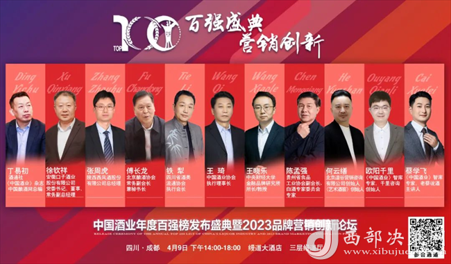 西部決策網(wǎng)訊(記者劉玉 韓宗憲)聚焦中國酒業(yè)百強群英,助力品牌營銷創(chuàng)新管理。4月9日,中國酒業(yè)年度百強榜發(fā)布盛典暨2023品牌營銷創(chuàng)新論壇在成都盛大開啟。行業(yè)各協(xié)會領導、智庫專家、意見領袖及全國200家企業(yè)和經(jīng)銷商代表,共同見證行業(yè)百強與酒業(yè)營銷人的風采。