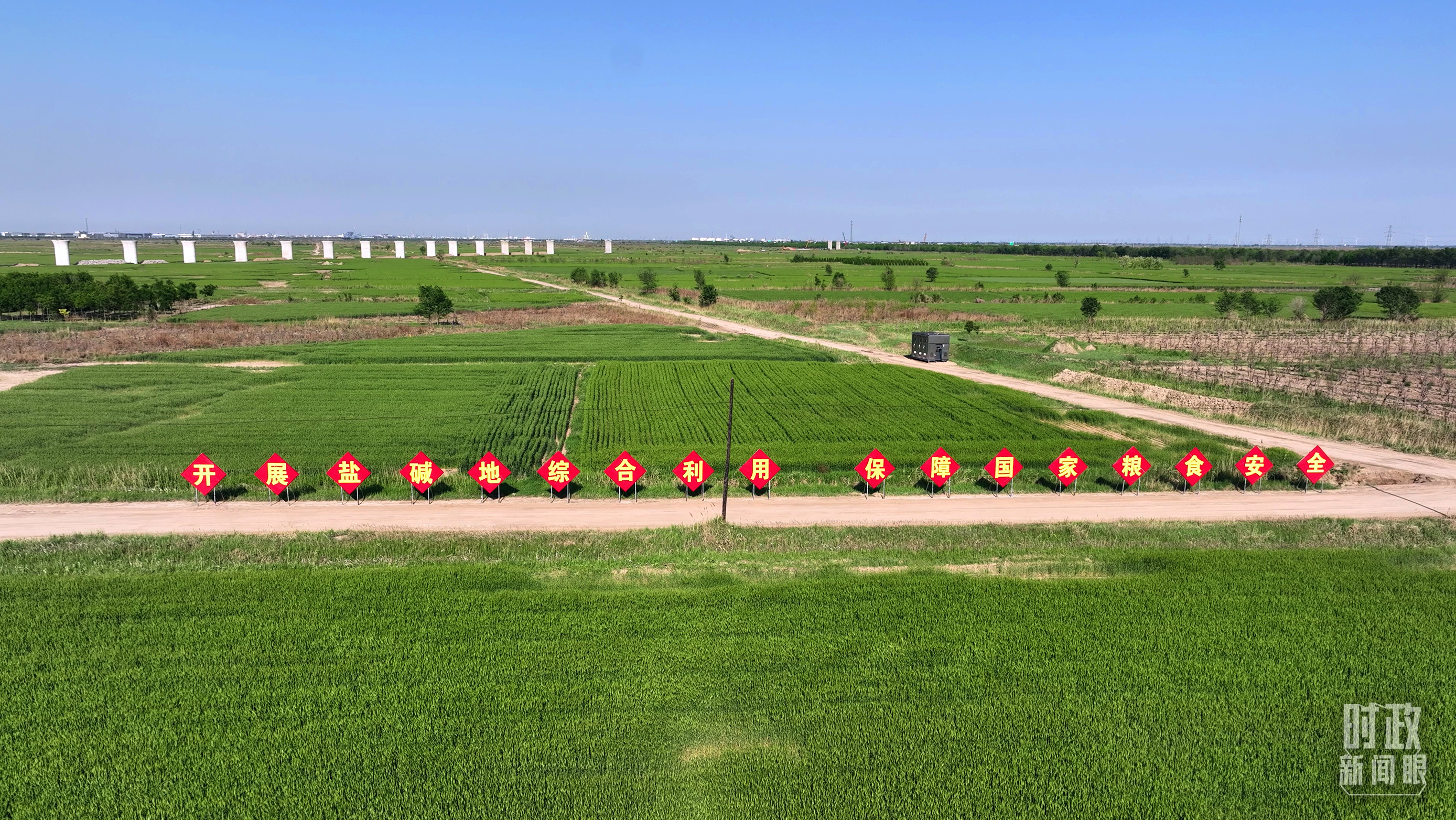 △旱堿麥田被分割成整齊劃一的綠色方塊。(總臺記者郭永良拍攝)