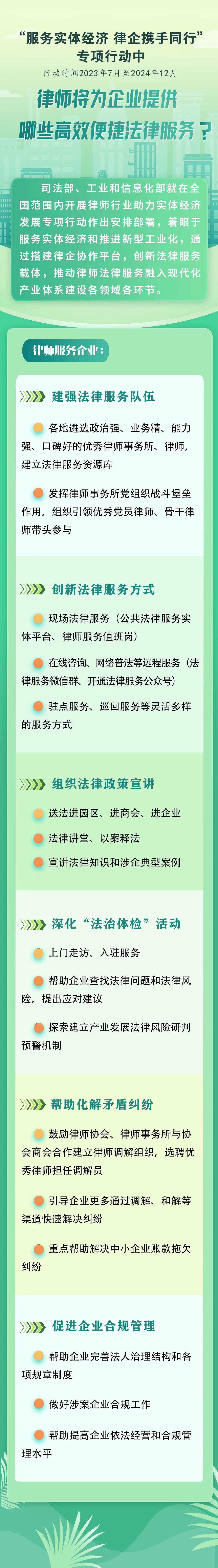 方案要求,各地司法行政部門、工業(yè)和信息化主管部門、通信管理局和律師協(xié)會(huì)要共同組織優(yōu)秀律師事務(wù)所和律師,為工業(yè)和信息化領(lǐng)域相關(guān)企業(yè)提供全業(yè)務(wù)、全時(shí)空、高效便捷的法律服務(wù)?;顒?dòng)中,要摸清各類企業(yè)法律服務(wù)需求,建強(qiáng)法律服務(wù)隊(duì)伍,創(chuàng)新法律服務(wù)方式,通過開展法律政策宣講、深化“法治體檢”活動(dòng)等形式,推動(dòng)律師行業(yè)服務(wù)實(shí)體經(jīng)濟(jì)的廣度和深度不斷拓展,服務(wù)的專業(yè)性、精準(zhǔn)性、便捷性、實(shí)效性不斷增強(qiáng),幫助企業(yè)化解法律風(fēng)險(xiǎn),解決法律問題,維護(hù)合法權(quán)益,提升依法合規(guī)經(jīng)營管理水平。