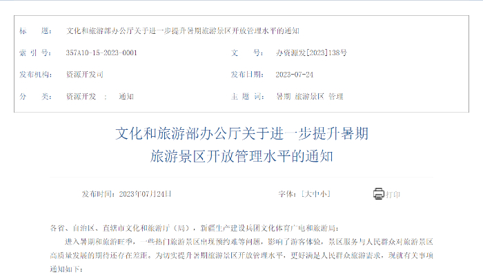 通知中稱,進(jìn)入暑期和旅游旺季,一些熱門旅游景區(qū)出現(xiàn)預(yù)約難等問題,影響了游客體驗(yàn),景區(qū)服務(wù)與人民群眾對旅游景區(qū)高質(zhì)量發(fā)展的期待還存在差距。為切實(shí)提升暑期旅游景區(qū)開放管理水平,更好滿足人民群眾旅游需求,現(xiàn)就有關(guān)事項(xiàng)通知如下: