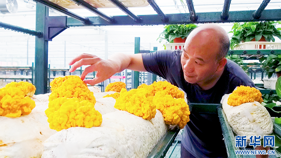 在金米智慧農(nóng)業(yè)產(chǎn)業(yè)園里,技術(shù)負(fù)責(zé)人陳盛林查看金耳長勢。新華網(wǎng) 楊喜龍 攝
