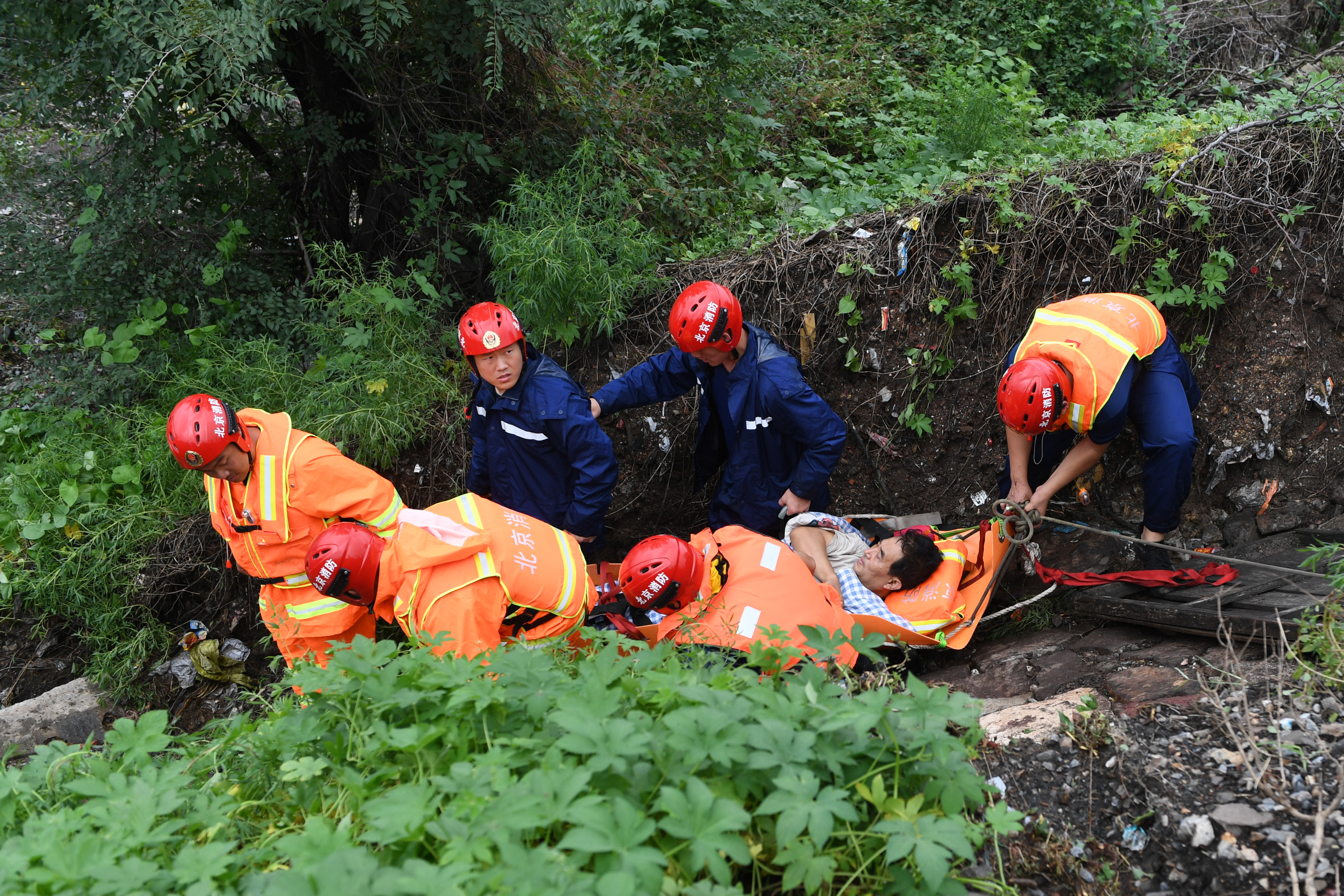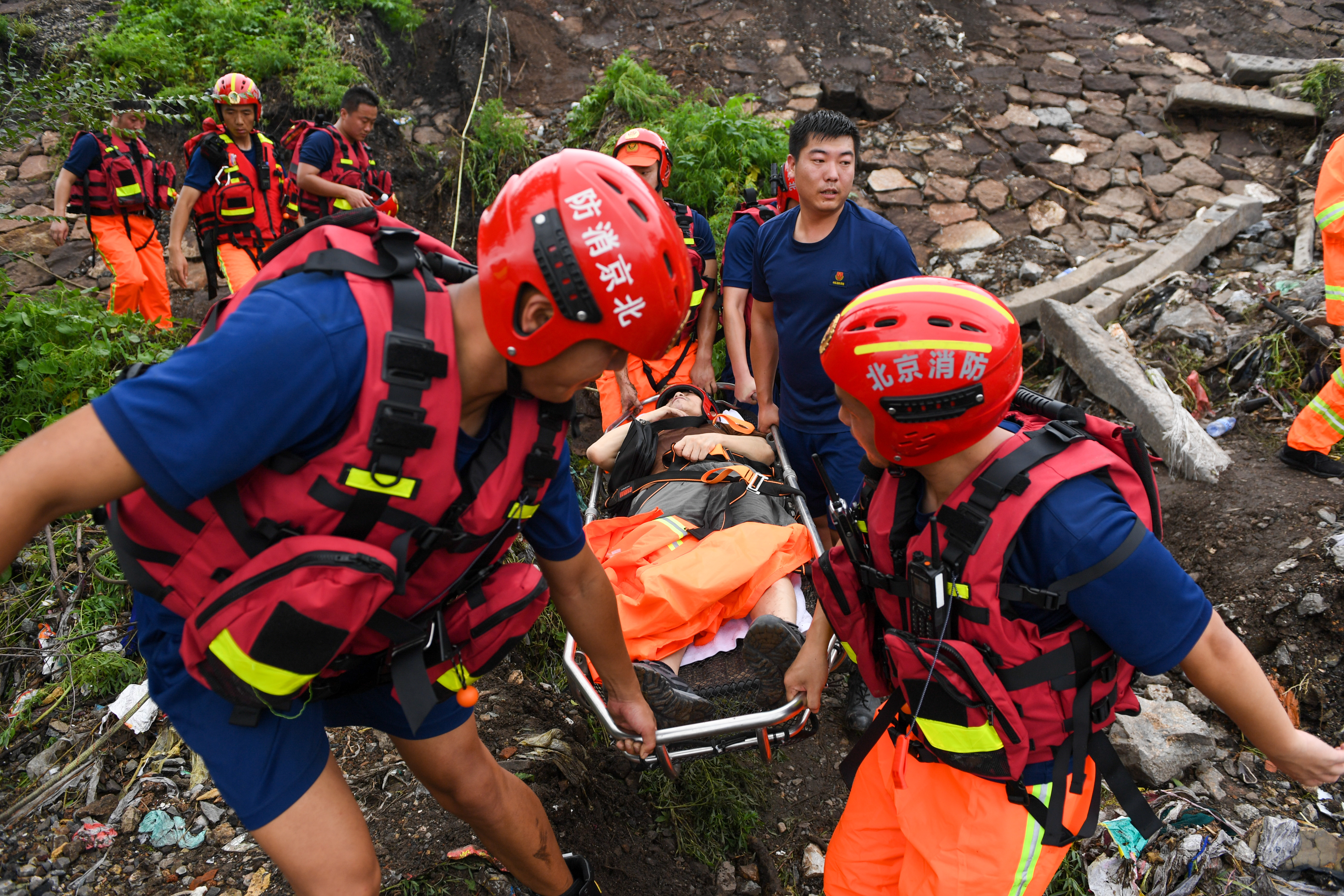 8月1日,在北京市門頭溝區(qū)水峪嘴村,北京門頭溝區(qū)消防救援支隊的消防員在轉(zhuǎn)運一名受傷村民。新華社記者 鞠煥宗 攝