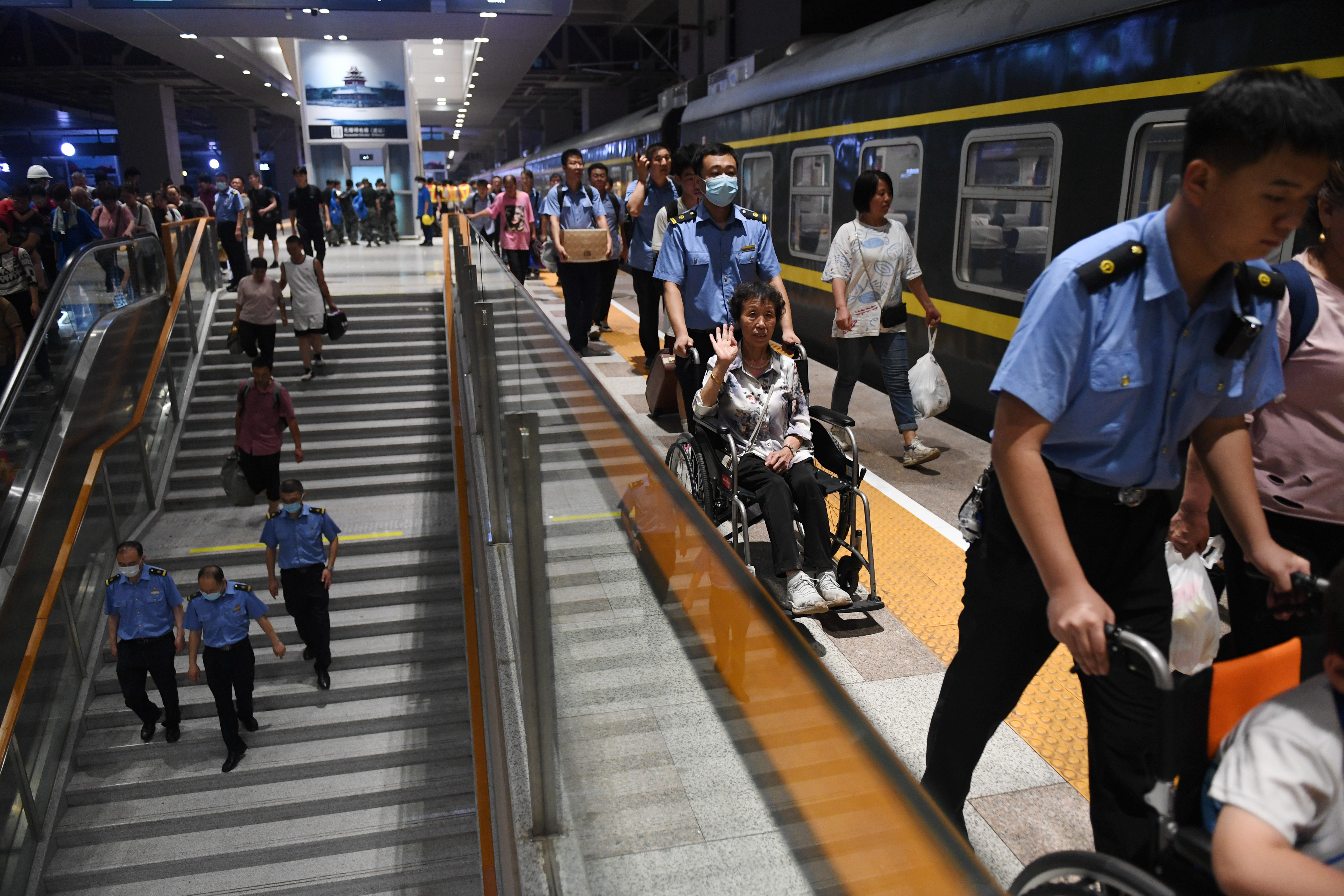 8月3日,K396次、Z180次列車的滯留旅客到達(dá)北京豐臺站。新華社記者 張晨霖 攝