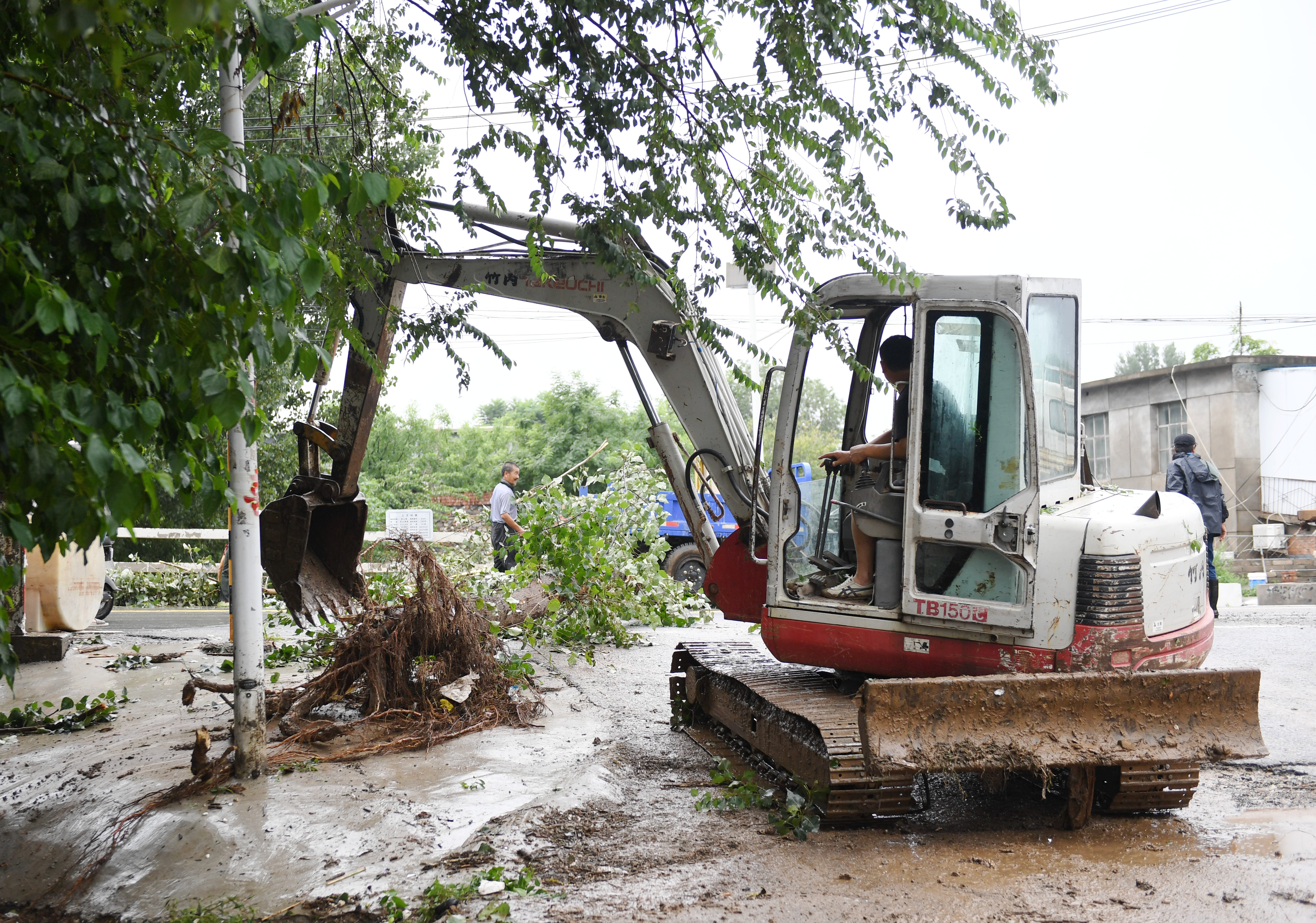 8月1日,在北京市房山區(qū)青龍湖鎮(zhèn)上萬村,工作人員清理倒伏樹木。新華社記者 張晨霖 攝