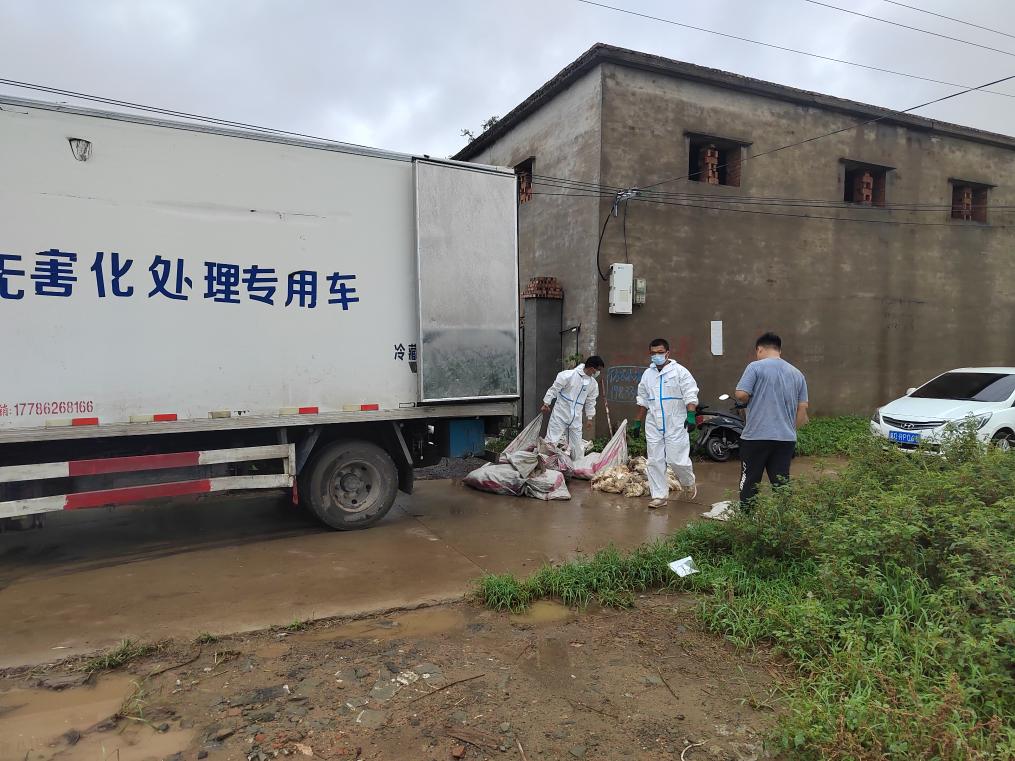 在邯鄲市雞澤縣雙塔鎮(zhèn)中申底村一家蛋雞養(yǎng)殖場(chǎng)內(nèi),縣農(nóng)業(yè)農(nóng)村局動(dòng)物衛(wèi)生監(jiān)督所負(fù)責(zé)人高仁鵬帶領(lǐng)消毒技術(shù)指導(dǎo)組成員對(duì)養(yǎng)殖場(chǎng)內(nèi)淹死的410只蛋雞進(jìn)行集中收集,通過(guò)專(zhuān)業(yè)車(chē)輛運(yùn)往病死畜禽無(wú)害化處理廠(chǎng)進(jìn)行專(zhuān)業(yè)處理。