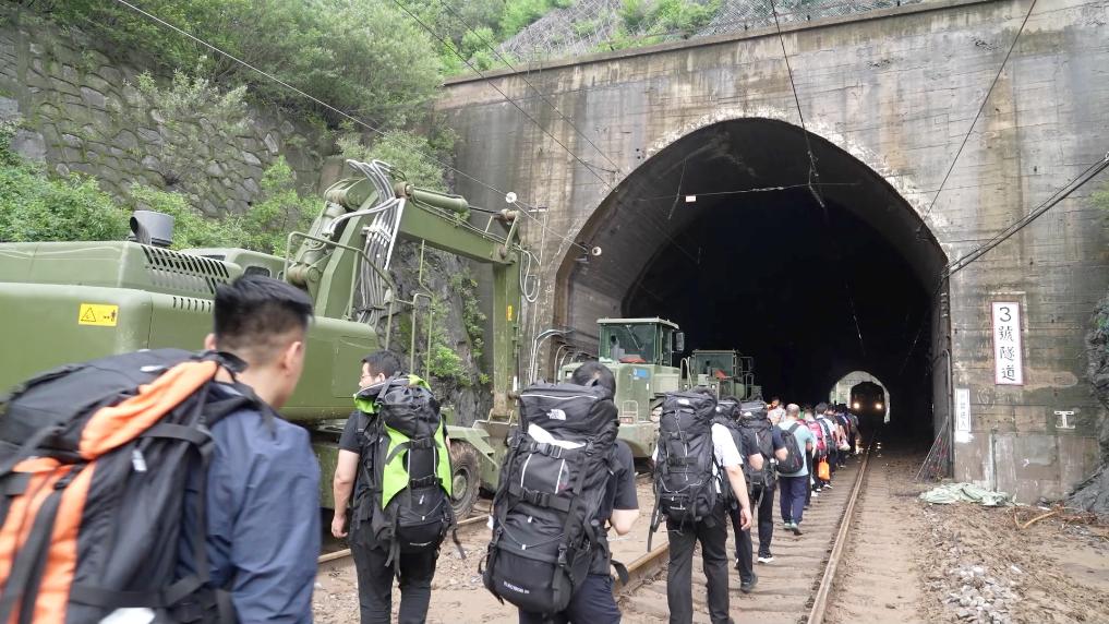 隨后,突擊隊成員徒步攜帶生活物資向安家莊站、落坡嶺站行進。身負30至40斤背包,沿著受損的鐵路線,徒步11余公里,穿越7個隧道,為安家莊站、落坡嶺站滯留旅客及時送去物資。