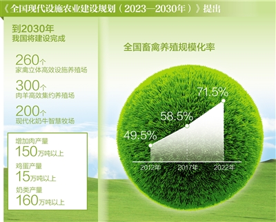 規(guī)?;O(shè)施化養(yǎng)殖助推畜牧業(yè)綜合產(chǎn)能提升。《全國現(xiàn)代設(shè)施農(nóng)業(yè)建設(shè)規(guī)劃(2023—2030年)》(以下簡稱《規(guī)劃》)提出,到2030年建設(shè)完成260個(gè)家禽立體高效設(shè)施養(yǎng)殖場、200個(gè)肉牛高效集約養(yǎng)殖場、300個(gè)肉羊高效集約養(yǎng)殖場和200個(gè)現(xiàn)代化奶牛智慧牧場,增加肉產(chǎn)量150萬噸以上、雞蛋產(chǎn)量15萬噸以上、奶類產(chǎn)量160萬噸以上,我國的肉蛋奶供應(yīng)保障水平將進(jìn)一步提高。