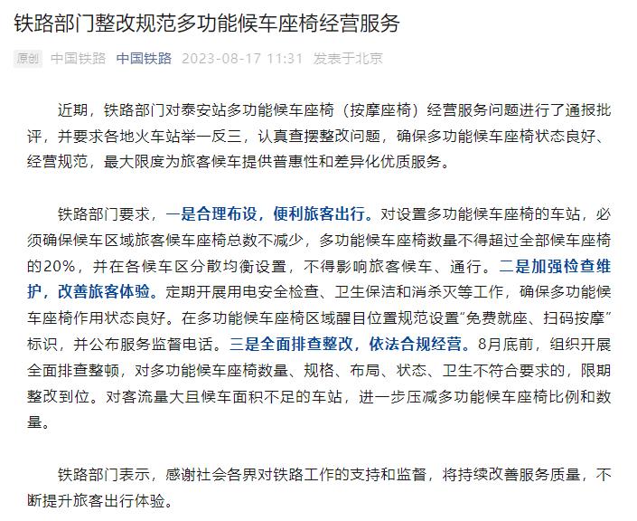 鐵路部門要求,一是合理布設(shè),便利旅客出行。對(duì)設(shè)置多功能候車座椅的車站,必須確保候車區(qū)域旅客候車座椅總數(shù)不減少,多功能候車座椅數(shù)量不得超過全部候車座椅的20%,并在各候車區(qū)分散均衡設(shè)置,不得影響旅客候車、通行。二是加強(qiáng)檢查維護(hù),改善旅客體驗(yàn)。定期開展用電安全檢查、衛(wèi)生保潔和消殺滅等工作,確保多功能候車座椅作用狀態(tài)良好。在多功能候車座椅區(qū)域醒目位置規(guī)范設(shè)置“免費(fèi)就座、掃碼按摩”標(biāo)識(shí),并公布服務(wù)監(jiān)督電話。三是全面排查整改,依法合規(guī)經(jīng)營(yíng)。8月底前,組織開展全面排查整頓,對(duì)多功能候車座椅數(shù)量、規(guī)格、布局、狀態(tài)、衛(wèi)生不符合要求的,限期整改到位。對(duì)客流量大且候車面積不足的車站,進(jìn)一步壓減多功能候車座椅比例和數(shù)量。