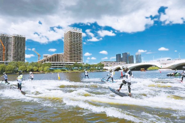 今年7月,2023年全國電動沖浪板聯(lián)賽(北京大運河站)在北運河開賽,這也是副中心在大運河首次承辦國家級動力板聯(lián)賽?;顒蝇F(xiàn)場,參賽運動員在風(fēng)景如畫的大運河上踏浪飛馳,吶喊聲、歡呼聲在河兩岸此起彼伏,飛濺的浪花、激情的運動、歡樂的人群,共同構(gòu)成了一幅炫彩、活力的運河新圖景。