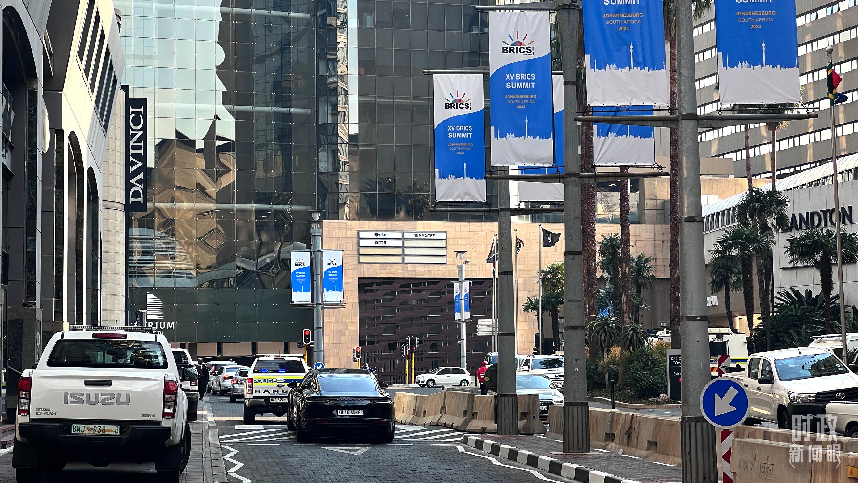 △約翰內(nèi)斯堡街道兩側(cè)懸掛的中國國旗。(總臺央視記者韓銳拍攝)