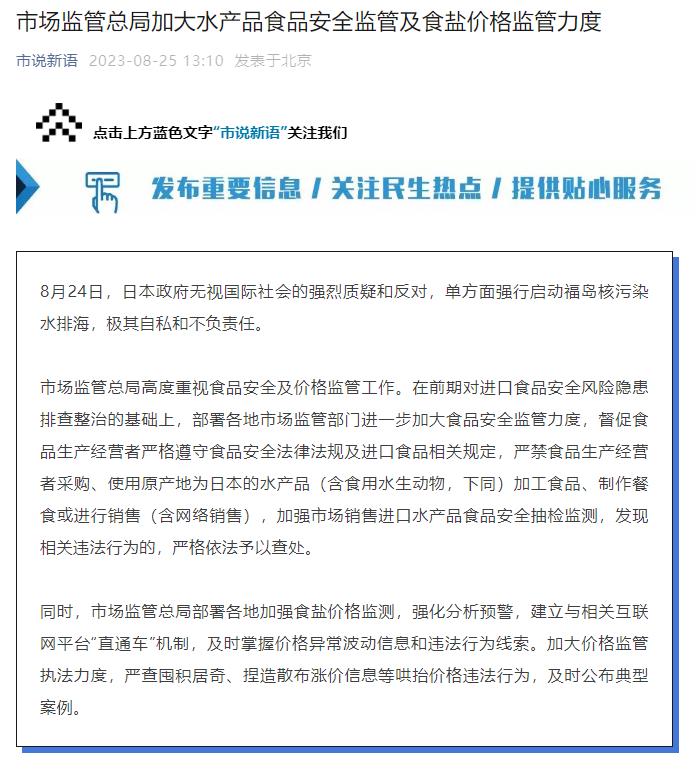 市場監(jiān)管總局高度重視食品安全及價格監(jiān)管工作。在前期對進口食品安全風險隱患排查整治的基礎(chǔ)上,部署各地市場監(jiān)管部門進一步加大食品安全監(jiān)管力度,督促食品生產(chǎn)經(jīng)營者嚴格遵守食品安全法律法規(guī)及進口食品相關(guān)規(guī)定,嚴禁食品生產(chǎn)經(jīng)營者采購、使用原產(chǎn)地為日本的水產(chǎn)品(含食用水生動物,下同)加工食品、制作餐食或進行銷售(含網(wǎng)絡銷售),加強市場銷售進口水產(chǎn)品食品安全抽檢監(jiān)測,發(fā)現(xiàn)相關(guān)違法行為的,嚴格依法予以查處。