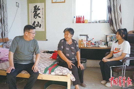 8月21日,北京市房山區(qū)石樓中學(xué)校長(zhǎng)郭洪生(左一)來(lái)到原夏村中學(xué)初二學(xué)生索鑫雨(左三)家中,為索鑫雨和其奶奶(左二)講解入學(xué)政策。張藝/攝