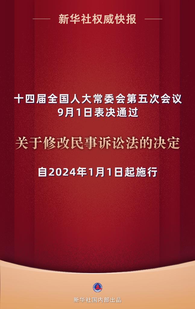 9月1日,十四屆全國人大常委會第五次會議表決通過關(guān)于修改民事訴訟法的決定,自2024年1月1日起施行。