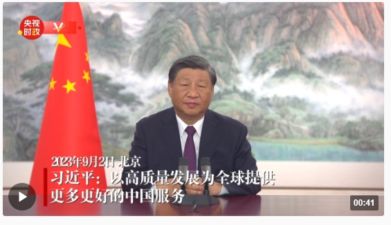 9月2日上午,國(guó)家主席習(xí)近平在2023年中國(guó)國(guó)際服務(wù)貿(mào)易交易會(huì)全球服務(wù)貿(mào)易峰會(huì)上發(fā)表視頻致辭。
