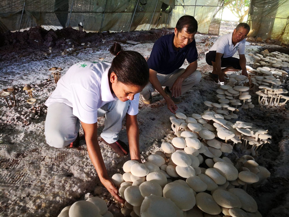 2018年6月12日,在斐濟楠迪,中國專家和當?shù)毓蛦T在檢查菌菇生長情況。新華社記者 張永興 攝