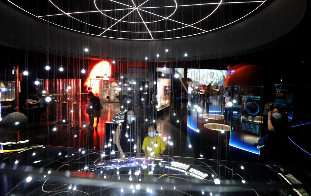 參觀者在上海天文館“家園”展區(qū)內(nèi)一個(gè)名為“太陽(yáng)的鄰居”的裝置展品前駐足觀看。新華社記者 方喆 攝