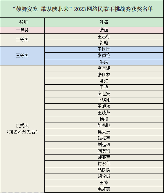 決賽現(xiàn)場,參賽選手們依次上場深情獻(xiàn)唱,《一對對鴛鴦水上漂》《小桃紅》《走西口》等經(jīng)典的陜北民歌喚起在場群眾陣陣掌聲。最終,經(jīng)過一番精彩獻(xiàn)唱,專家評審團(tuán)現(xiàn)場打分決出“鼓舞安塞 歌從陜北來”2023網(wǎng)絡(luò)民歌手挑戰(zhàn)賽一、二、三等獎(jiǎng)獲獎(jiǎng)選手及優(yōu)秀選手。其中,張麗獲得一等獎(jiǎng),王志行、賀艷獲得二等獎(jiǎng),王園園、張貞艷、牛榮獲得三等獎(jiǎng),因4名民歌歌手棄權(quán)比賽,剩余20名民歌歌手均獲優(yōu)秀獎(jiǎng)。
