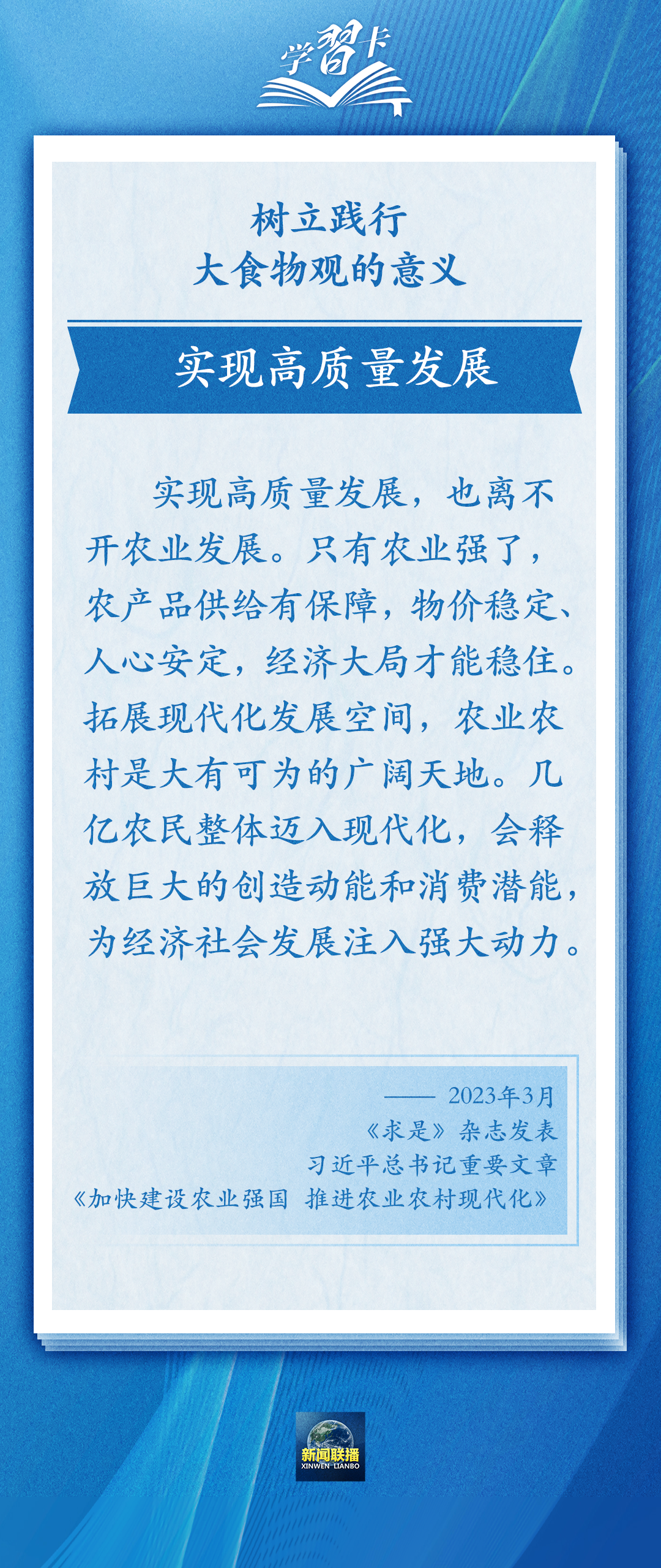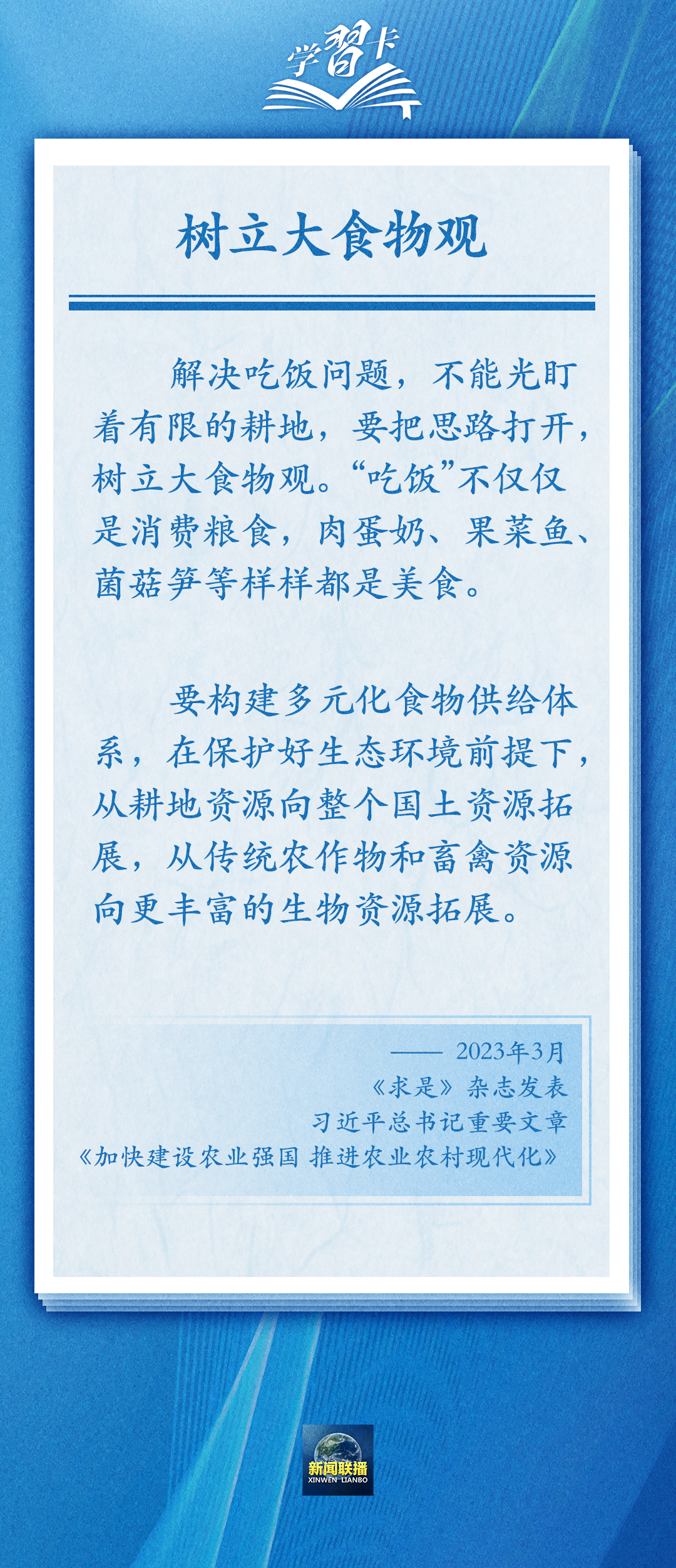 國(guó)以民為本,民以食為天。習(xí)近平總書(shū)記在黨的二十大報(bào)告中強(qiáng)調(diào),全方位夯實(shí)糧食安全根基,樹(shù)立大食物觀,構(gòu)建多元化食物供給體系,確保中國(guó)人的飯碗牢牢端在自己手中。