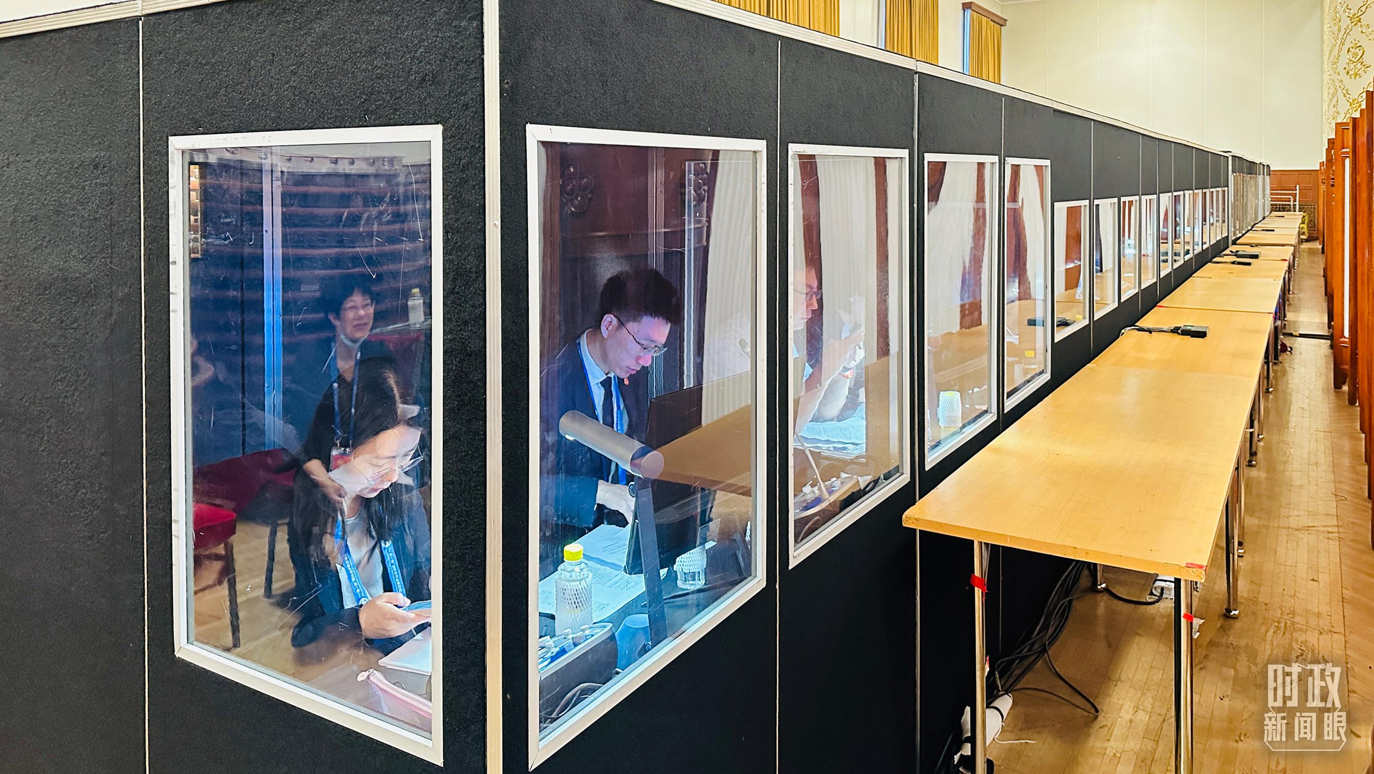 △開幕式現(xiàn)場(chǎng)的多語(yǔ)種同傳間。(總臺(tái)國(guó)廣記者時(shí)冉拍攝)