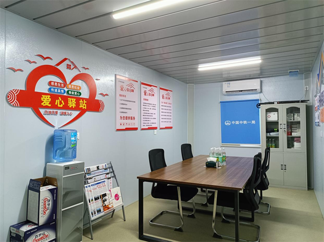 服務(wù)站門(mén)口即是S312省道,距離轉(zhuǎn)體梁主要施工工點(diǎn)不足500米,步行8到10分鐘可達(dá)。服務(wù)對(duì)象包括勞動(dòng)工人、環(huán)衛(wèi)綠化工人、市政維修工人等戶(hù)外勞動(dòng)者。站點(diǎn)內(nèi)溫暖明亮,空調(diào)和飲水機(jī)的冷熱水24小時(shí)提供便利,雨傘架、充電站解決燃眉之急。急救藥箱內(nèi)含有退燒貼和暖貼,感冒消炎、消毒止血常備藥以供不時(shí)之需,除此之外還增設(shè)特色閱讀區(qū),各類(lèi)書(shū)籍、月刊、報(bào)紙可供勞動(dòng)者休息時(shí)閱讀放松,并由工作人員定期更新。