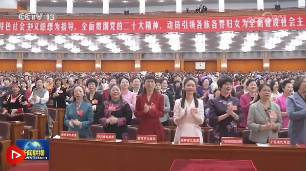 人民大會堂大禮堂氣氛莊重?zé)崃?。主席臺上方懸掛著“中國婦女第十三次全國代表大會”會標(biāo),后幕正中是鮮艷的中華全國婦女聯(lián)合會會徽,10面紅旗分列兩側(cè)。二樓眺臺懸掛著“以習(xí)近平新時(shí)代中國特色社會主義思想為指導(dǎo),全面貫徹黨的二十大精神,動(dòng)員引領(lǐng)各族各界婦女為全面建設(shè)社會主義現(xiàn)代化國家、全面推進(jìn)中華民族偉大復(fù)興而團(tuán)結(jié)奮斗!”巨型橫幅。