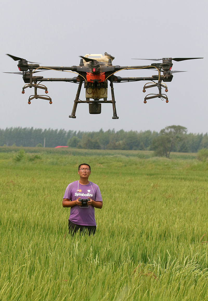 2021年7月27日,哈爾濱呼蘭區(qū)腰堡村的一片稻田間,忠萍農(nóng)作物種植專(zhuān)業(yè)合作社的“飛手”正在操縱無(wú)人機(jī)對(duì)水稻噴施葉面肥。