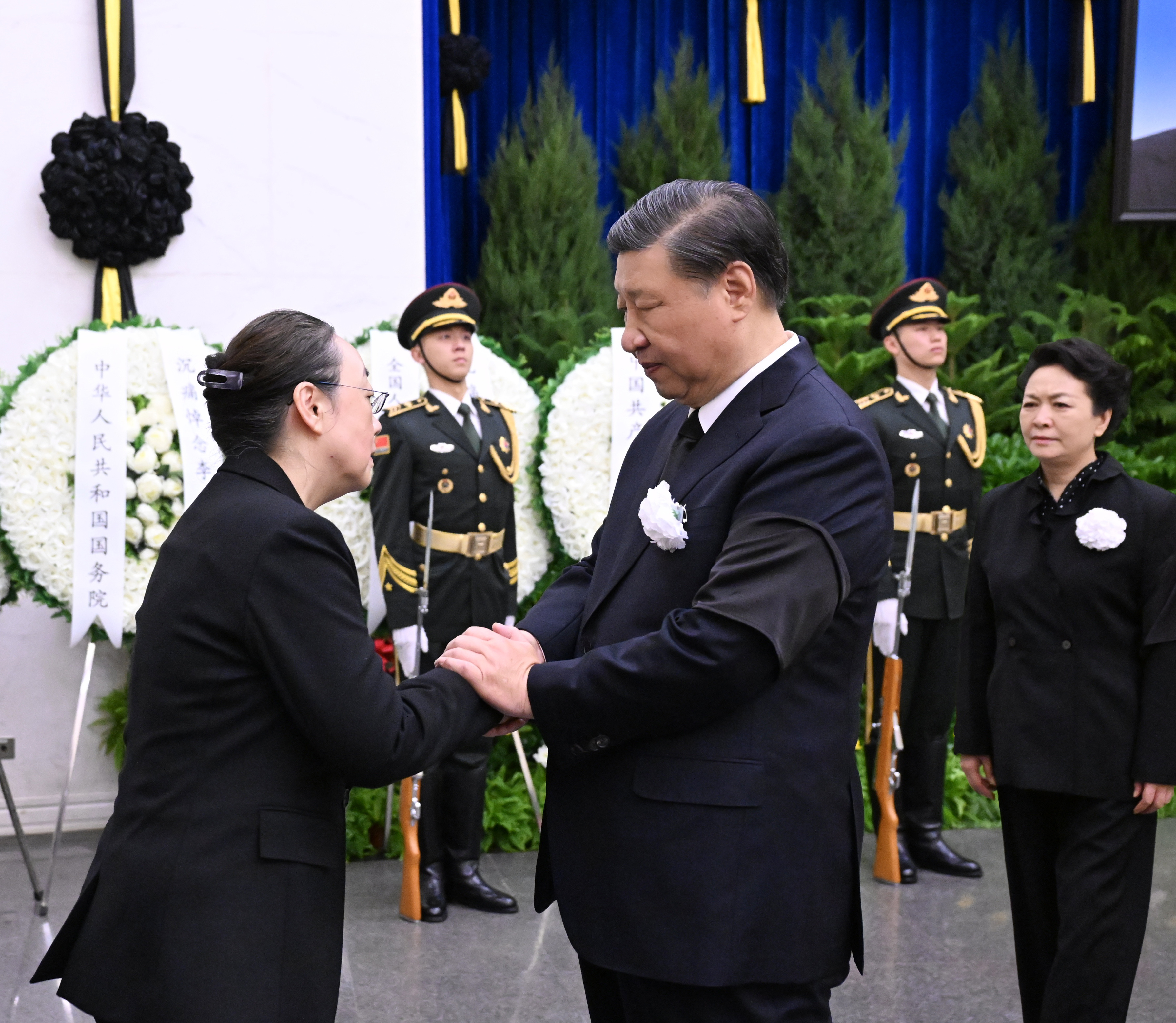 上午9時許,習(xí)近平和夫人彭麗媛,李強(qiáng)、趙樂際、王滬寧、蔡奇、丁薛祥、李希、韓正等,在哀樂聲中緩步來到李克強(qiáng)同志的遺體前肅立默哀,向李克強(qiáng)同志的遺體三鞠躬,并與李克強(qiáng)同志親屬一一握手,表示慰問。胡錦濤送花圈,對李克強(qiáng)同志逝世表示哀悼。