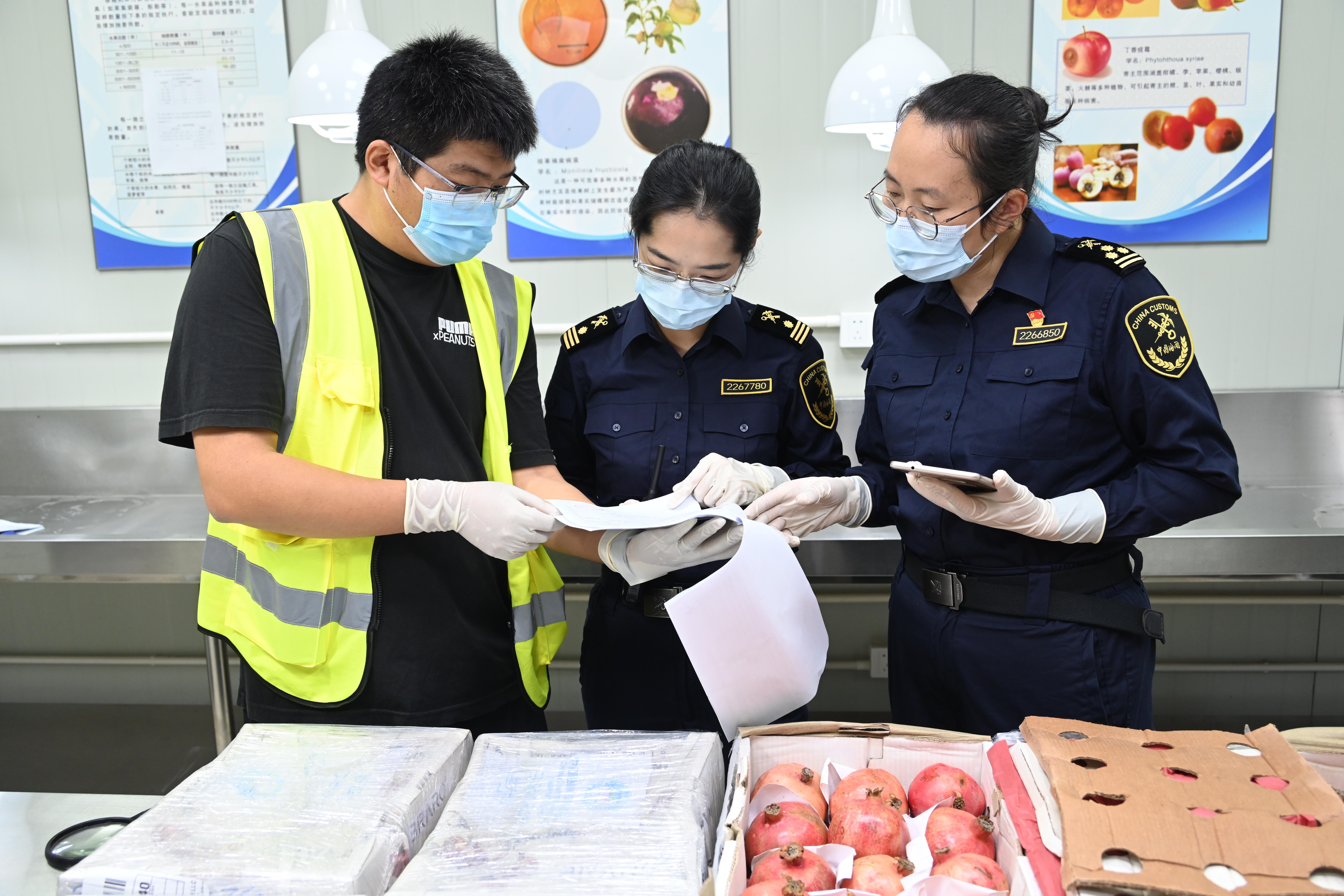 △2023年11月2日,上海浦東國際機(jī)場,經(jīng)海關(guān)檢查無誤后,一批200千克來自阿富汗的石榴正常通關(guān),運往第六屆進(jìn)博會現(xiàn)場。