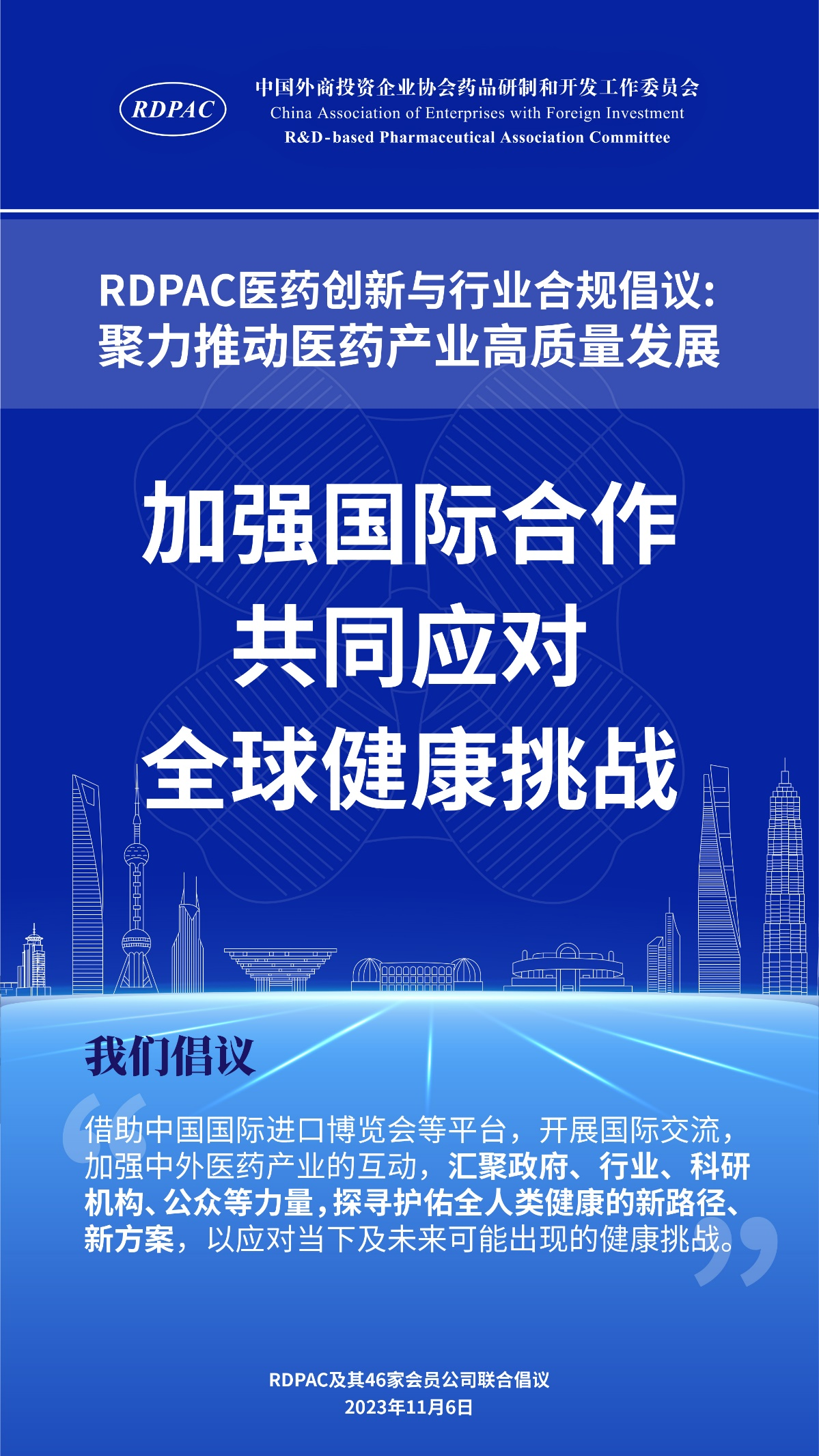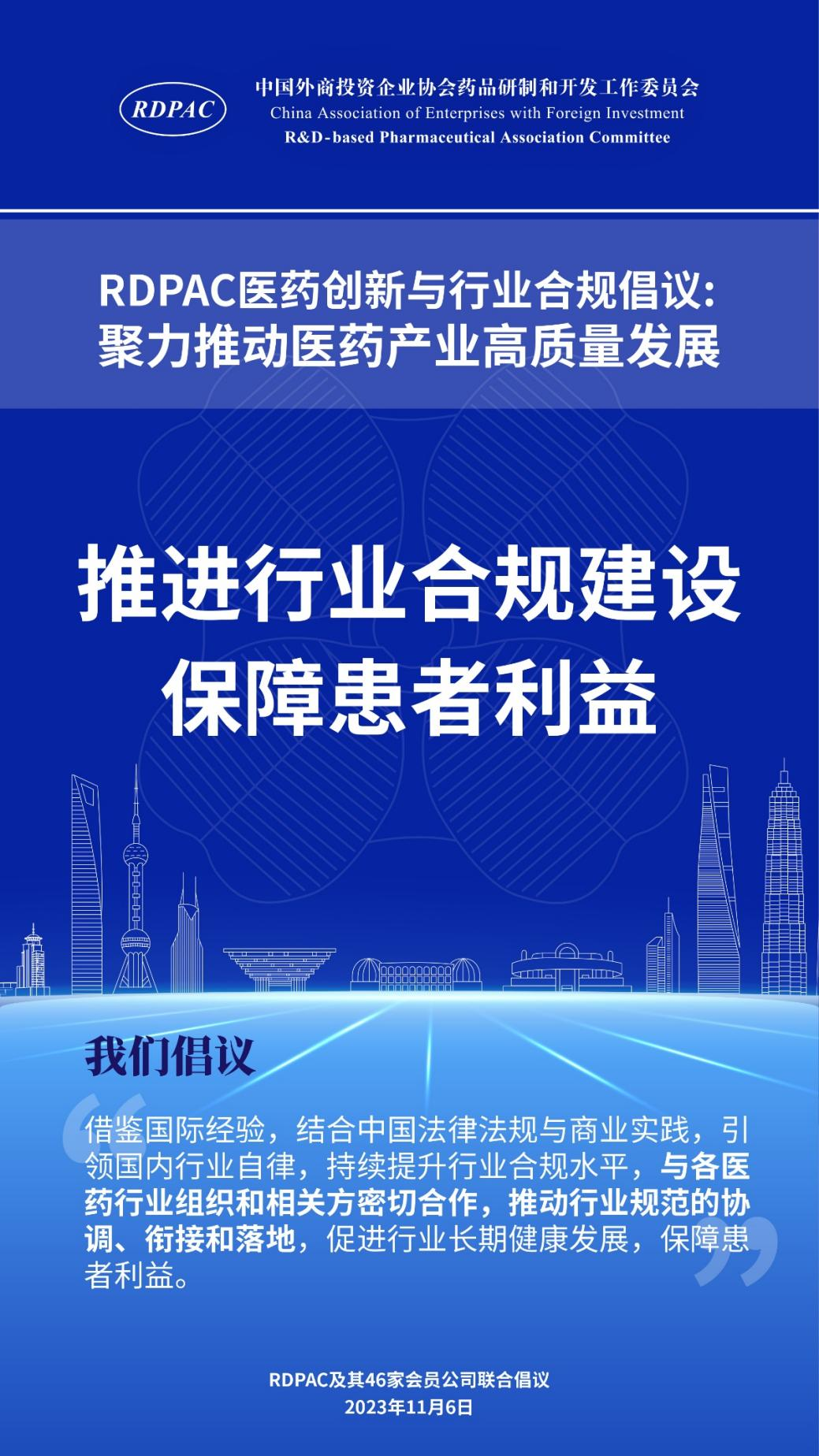 11月6日,中國外商投資企業(yè)協(xié)會藥品研制和開發(fā)工作委員會 (以下簡稱 “RDPAC”)及其成員公司在華負(fù)責(zé)人共同發(fā)起“RDPAC醫(yī)藥創(chuàng)新與行業(yè)合規(guī)倡議”,致力于打造充滿活力的醫(yī)藥創(chuàng)新生態(tài)系統(tǒng)、完善的行業(yè)合規(guī)體系,聚力推動中國醫(yī)藥產(chǎn)業(yè)的高質(zhì)量發(fā)展,建設(shè)健康中國。