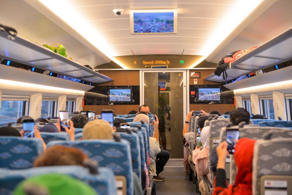 △2023年11月5日,在行駛中的雅萬(wàn)高鐵高速動(dòng)車組列車車廂內(nèi),乘客紛紛用手機(jī)拍攝顯示列車時(shí)速達(dá)到350公里的電子屏。