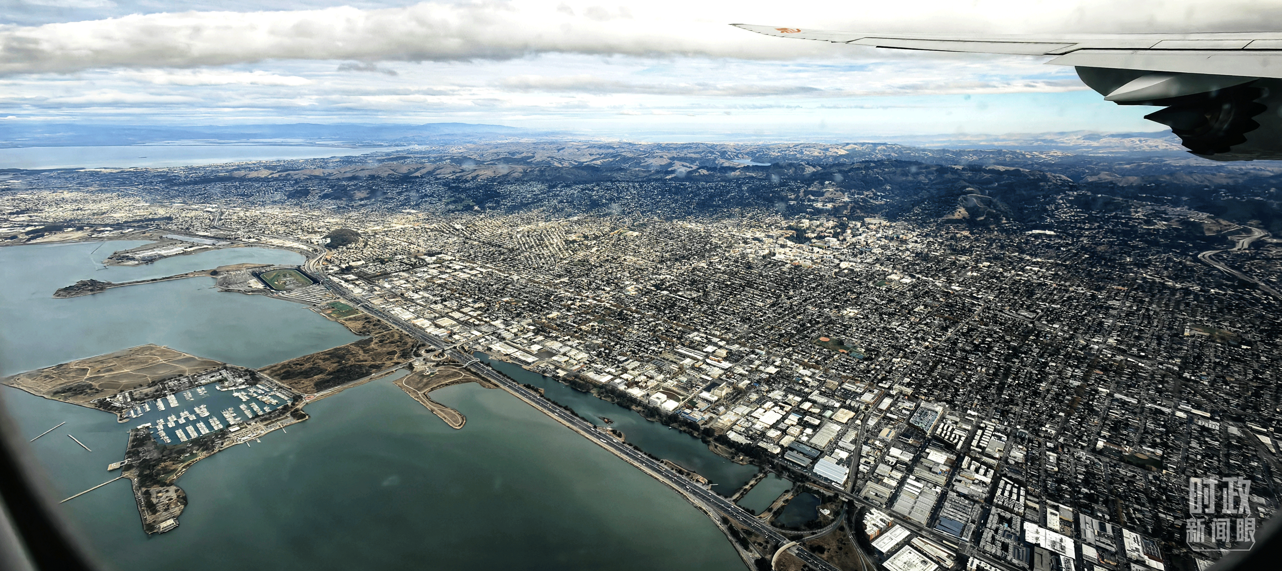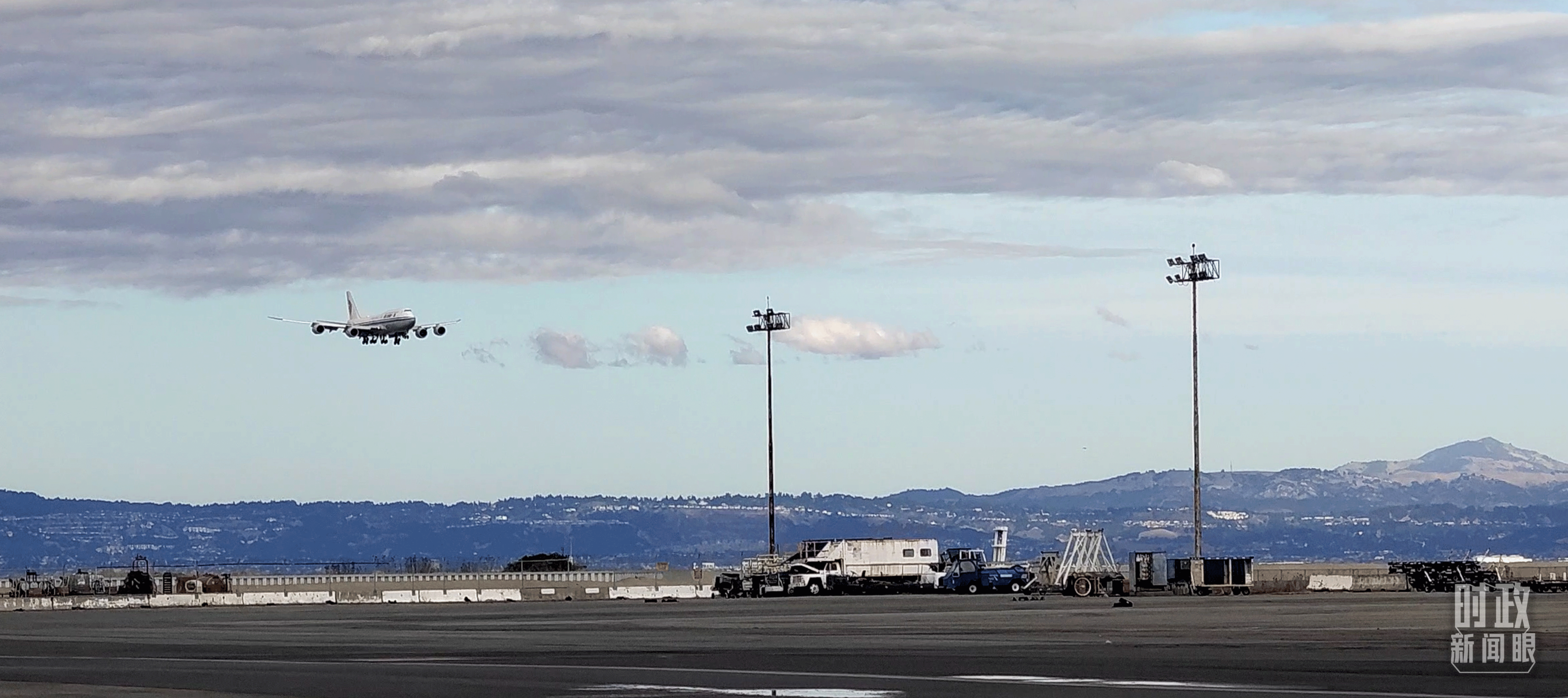 △習(xí)近平乘坐的專(zhuān)機(jī)即將降落舊金山國(guó)際機(jī)場(chǎng)。(總臺(tái)央視記者張曉鵬拍攝)