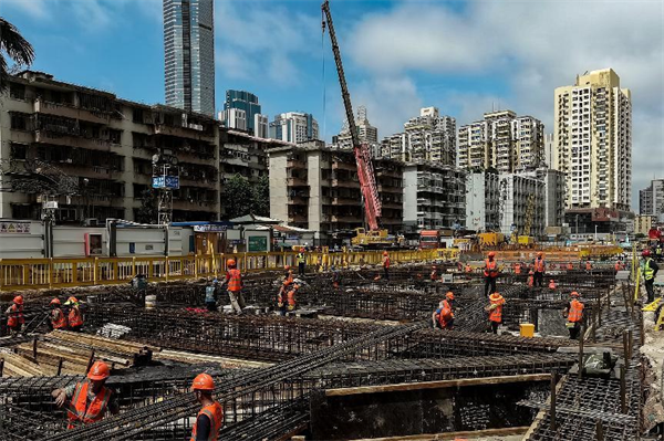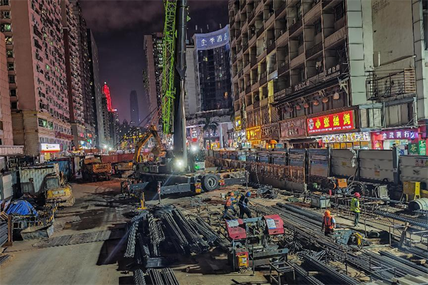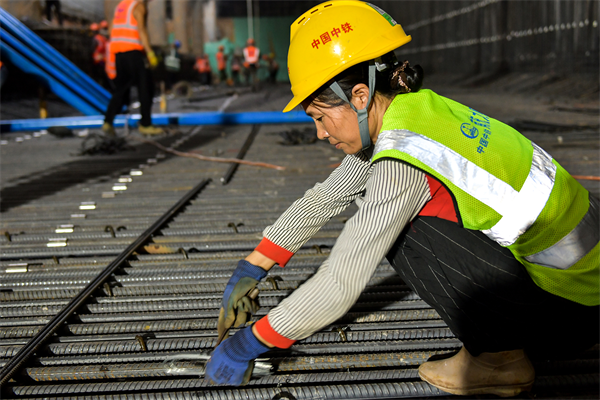 在1號(hào)工點(diǎn)的第3層基坑里,東邊,10幾名穿著印有工種名稱的反光馬甲的工人正忙著安裝模板鋼支撐;西邊,20幾名同樣穿著馬甲的工人,或綁扎鋼筋,或轉(zhuǎn)運(yùn)鋼筋,或焊接鋼筋……一派忙而有序的大干場(chǎng)面。在3號(hào)工點(diǎn)地面,華燈初上,1臺(tái)吊車(chē),4、5名鋼筋工、電焊工也在忙個(gè)不停……