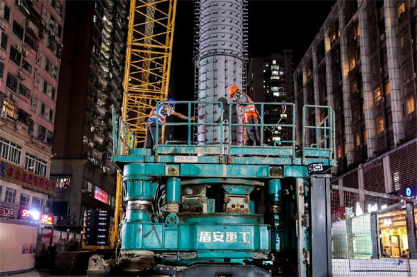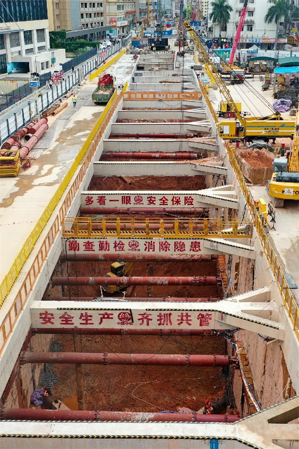 在鋼管立柱施工時(shí),遇見(jiàn)一條10千伏電力管線,空隙僅僅只有10厘米;還有一道污水管距離50厘米。為保護(hù)好管線,施工時(shí)管理人員現(xiàn)場(chǎng)全程指揮協(xié)調(diào),防止異常情況出現(xiàn)以便能及時(shí)協(xié)調(diào)解決,使鉆孔設(shè)備在小心翼翼地轉(zhuǎn)動(dòng)中安全順利完成了鋼管立柱插入施工。2022年10月10日,隨著最后一根26米長(zhǎng)的鋼管立柱緩緩吊裝、精準(zhǔn)插入鉆孔中,中大八院站蓋挖鋼管立柱全部完成施工。至此,項(xiàng)目部高風(fēng)險(xiǎn)大型起重吊裝施工全部完成、高噪音設(shè)備全部退場(chǎng),中大八院站全面進(jìn)入深基坑開(kāi)挖及主體施工階段。項(xiàng)目部經(jīng)受住了第二波考驗(yàn)。