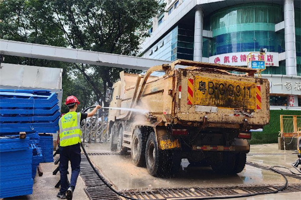 運(yùn)土車(chē)出工地大門(mén)前沖洗干凈