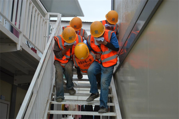 本次演練模擬施工現(xiàn)場電焊作業(yè)不慎點燃易燃材料擠塑板引發(fā)起火,引燃旁邊管理人員宿舍,導(dǎo)致一名人員疏散轉(zhuǎn)移不及時被困。演練現(xiàn)場設(shè)置了現(xiàn)場搶險、醫(yī)療救護、技術(shù)保障、物資設(shè)備保障、安全警戒、后勤保障6個應(yīng)急小組。隨著總指揮一聲令下,演練人員立即組織人員緊急疏散,對被圍困的二樓作業(yè)人員進行救援,同時組織人員進行滅火,參演人員按照既定路線有序逃生,安全到達指定地點。同時邀請消防支隊講解常用的消防器材及滅火設(shè)施。