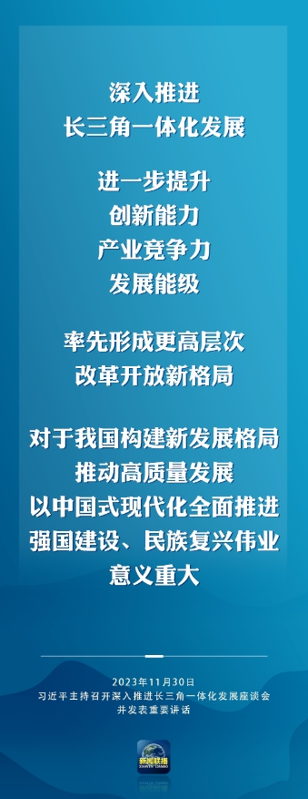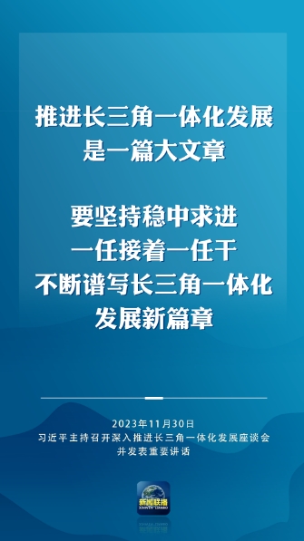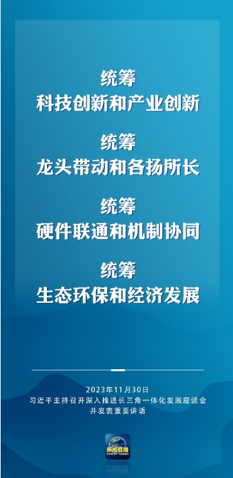 習(xí)近平強(qiáng)調(diào),要完整、準(zhǔn)確、全面貫徹新發(fā)展理念,緊扣一體化和高質(zhì)量這兩個(gè)關(guān)鍵詞,樹(shù)立全球視野和戰(zhàn)略思維,堅(jiān)定不移深化改革、擴(kuò)大高水平開(kāi)放,統(tǒng)籌科技創(chuàng)新和產(chǎn)業(yè)創(chuàng)新,統(tǒng)籌龍頭帶動(dòng)和各揚(yáng)所長(zhǎng),統(tǒng)籌硬件聯(lián)通和機(jī)制協(xié)同,統(tǒng)籌生態(tài)環(huán)保和經(jīng)濟(jì)發(fā)展,在推進(jìn)共同富裕上先行示范,在建設(shè)中華民族現(xiàn)代文明上積極探索,推動(dòng)長(zhǎng)三角一體化發(fā)展取得新的重大突破,在中國(guó)式現(xiàn)代化中走在前列,更好發(fā)揮先行探路、引領(lǐng)示范、輻射帶動(dòng)作用。