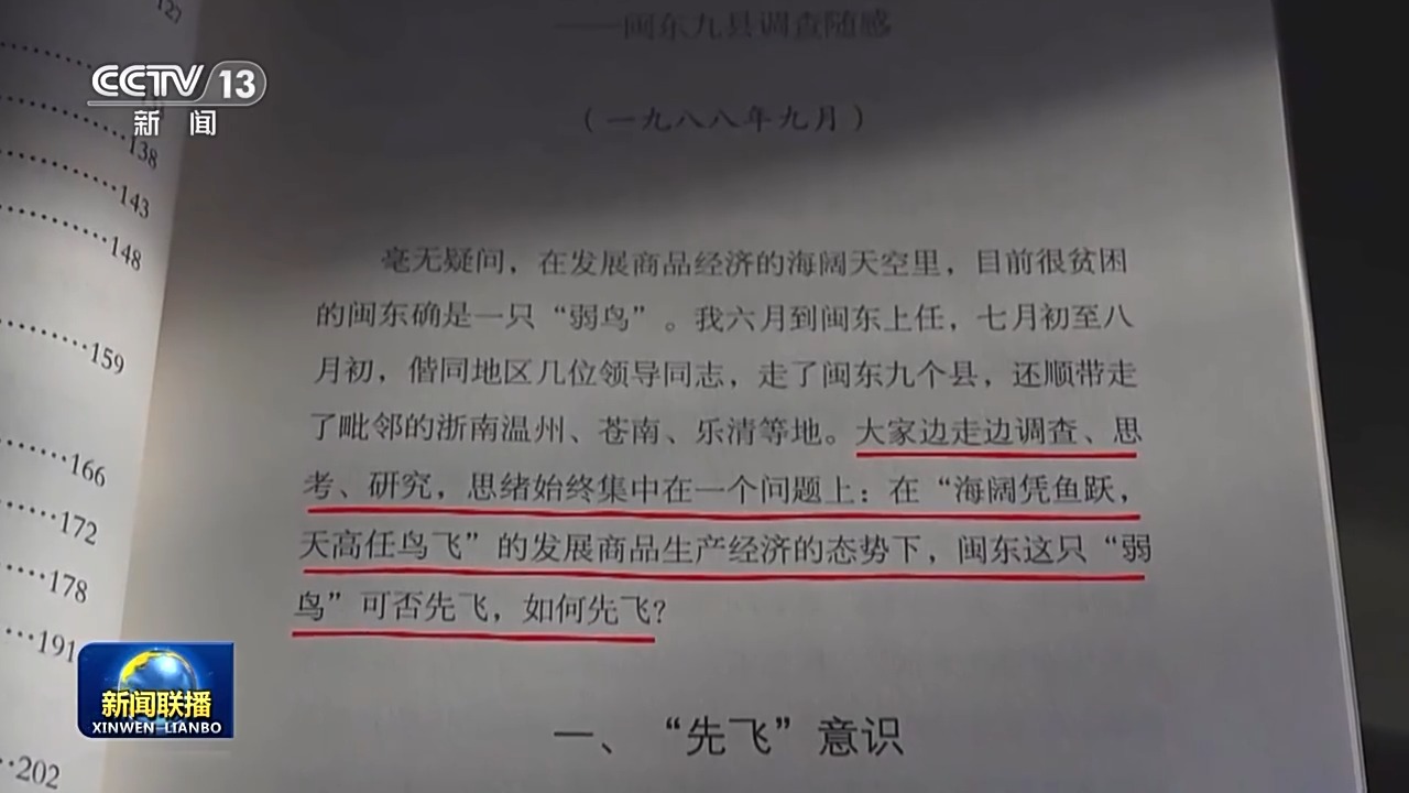 在一個(gè)多月里,習(xí)近平去了古田、屏南等9個(gè)縣的13個(gè)鄉(xiāng)鎮(zhèn)、18個(gè)村。隨后,他在《弱鳥如何先飛》這篇文章里寫道:大家邊走邊調(diào)查、思考、研究,思緒始終集中在一個(gè)問(wèn)題上,在“海闊憑魚躍,天高任鳥飛”的發(fā)展商品生產(chǎn)經(jīng)濟(jì)的態(tài)勢(shì)下,閩東這只“弱鳥”可否先飛,如何先飛?