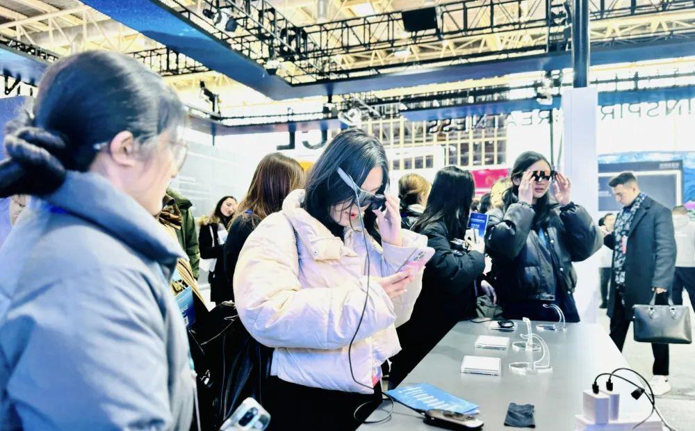 △鏈博會數(shù)字科技鏈展館一展位前,觀眾正在試戴AR眼鏡。