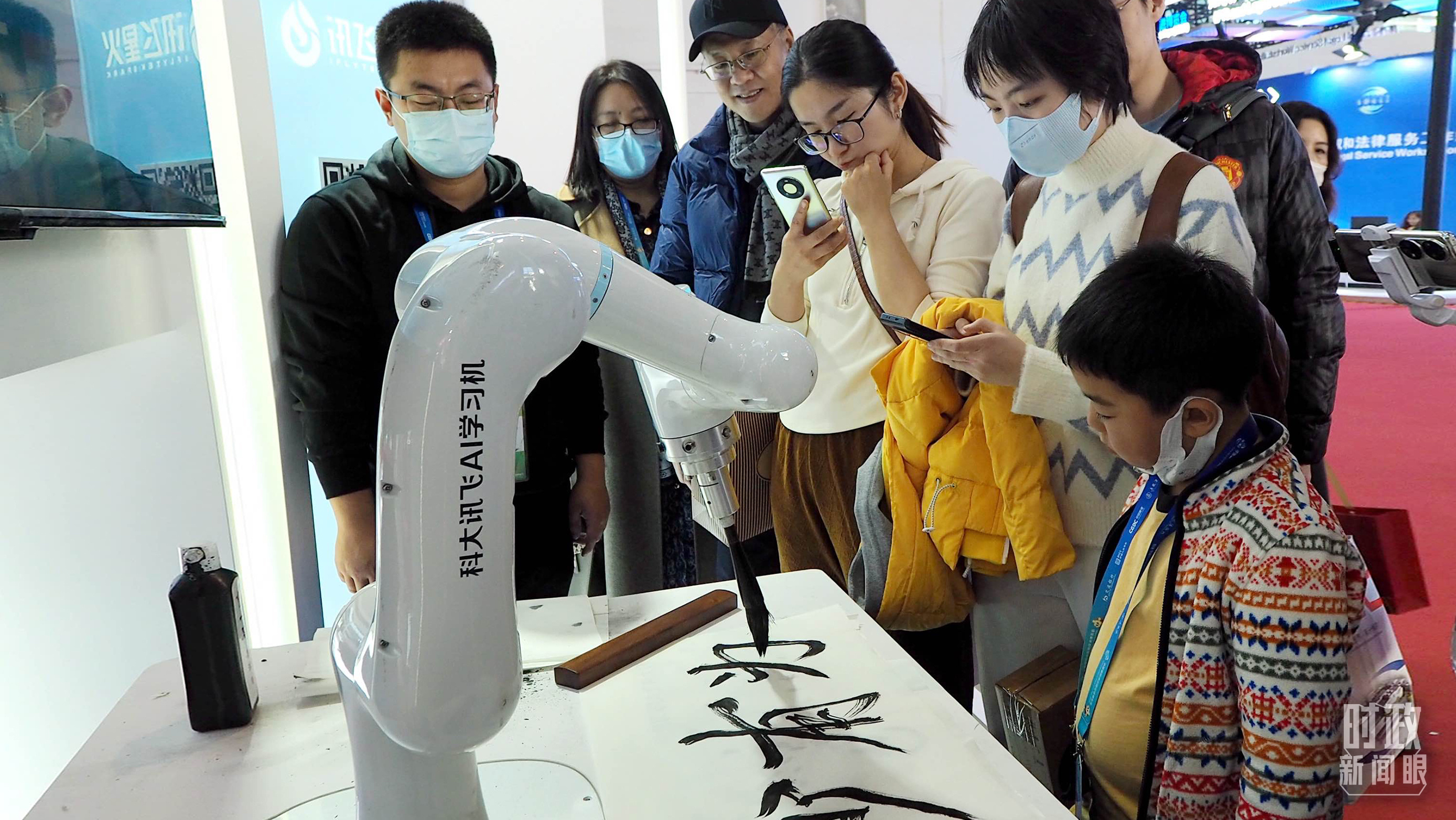 △觀眾在首屆鏈博會上體驗AI書法機器人。(圖/視覺中國)