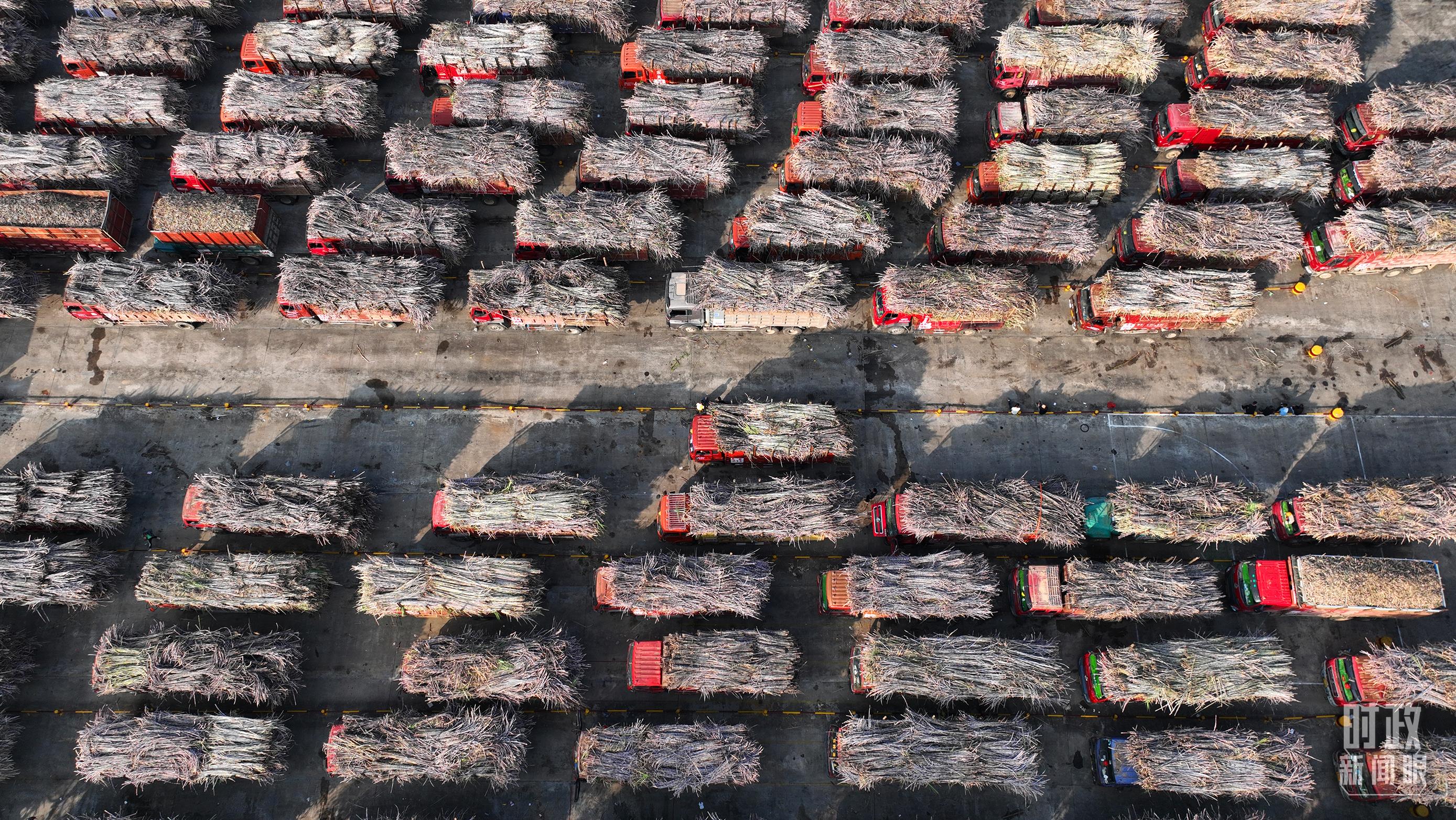 △來(lái)賓東糖鳳凰有限公司內(nèi)的甘蔗原料停放區(qū)。(總臺(tái)央視記者范凱拍攝)
