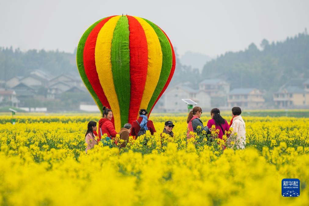 這是游客們?cè)诤鲜鸦袝?huì)同縣堡子鎮(zhèn)萬(wàn)畝油菜花海觀光、打卡(2023年3月1日攝)。新華社發(fā)(張鐳攝)